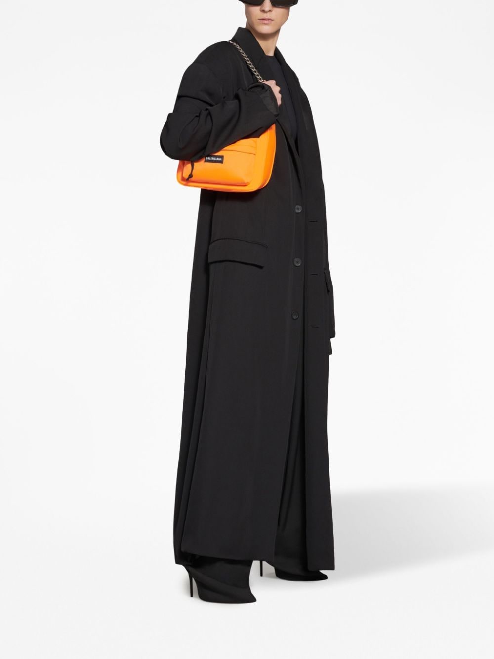 Balenciaga’s Raver style nods to sportswear accessories. Designed to look like a belt bag, it’s crafted from neon-orange recycled nylon and stitched with a contrast logo patch. It suspends from a chunky silver-tone chain-link shoulder strap.