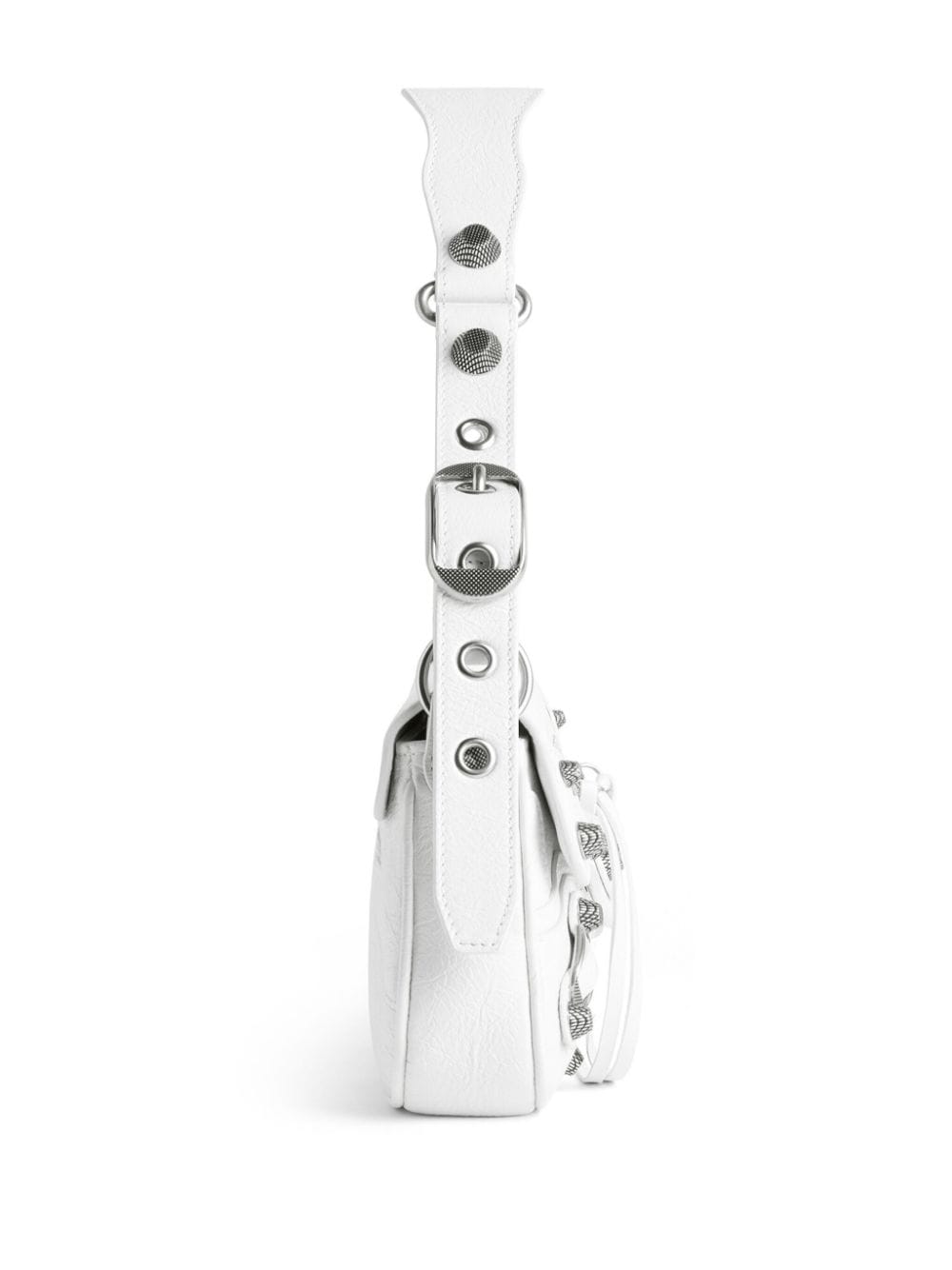 Instantly recognisable, Balenciaga’s Le Cagole design is continually reinterpreted in different shapes, textures and colourways. This white iteration is crafted from lambskin to a new elongated silhouette punctuated by the style’s signature studs and decorative buckles. It is held on an adjustable top handle for hand or shoulder carrying, whilst multiple pockets offer added functionality.