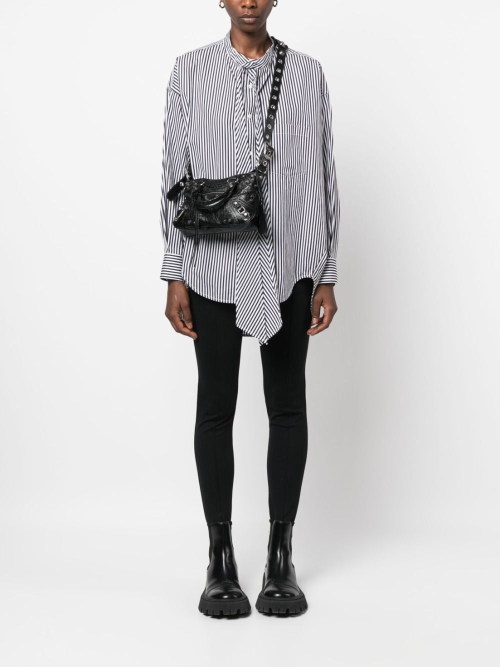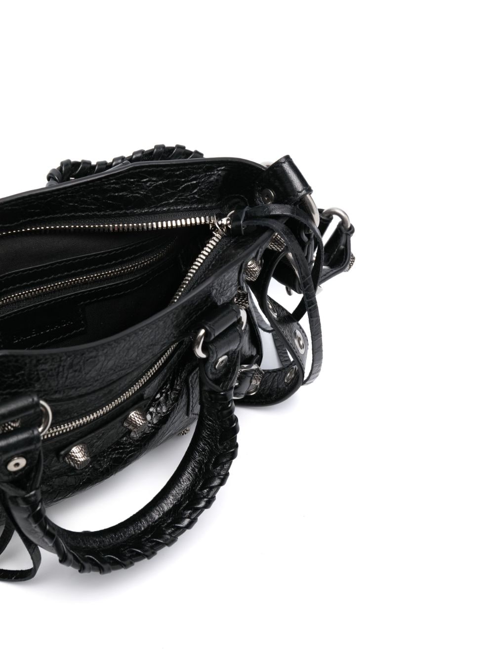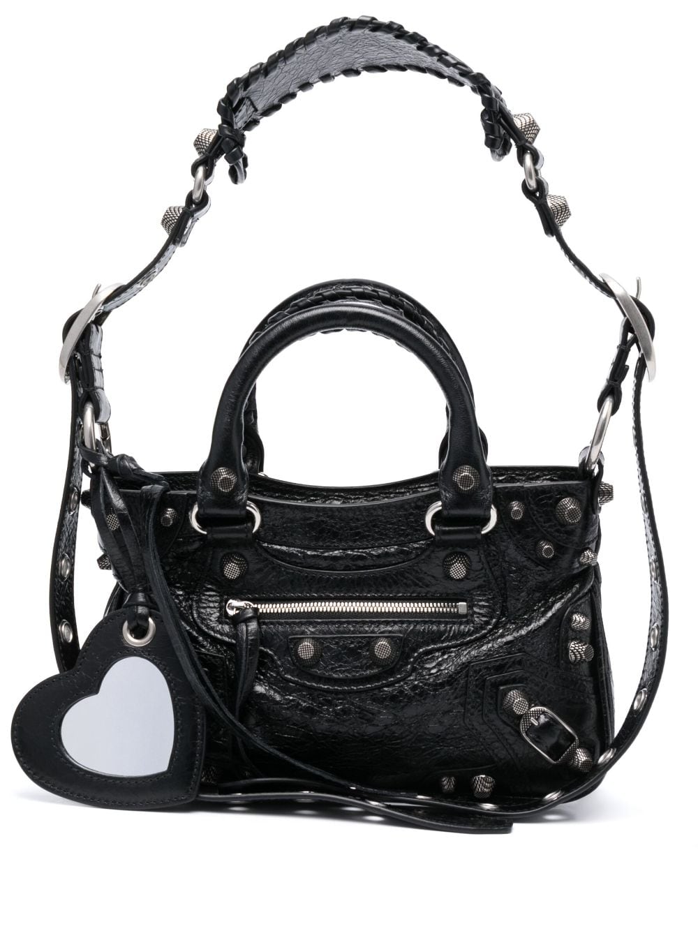 This version of Balenciaga’s Neo Cagole bag is crafted from black crinkle-effect leather with a subtle sheen. It boasts a trapeze silhouette with two top handles and a detachable, adjustable shoulder strap. Elements associated with the style include studs, zips, engraved buckles and a heart-shaped mirror.
