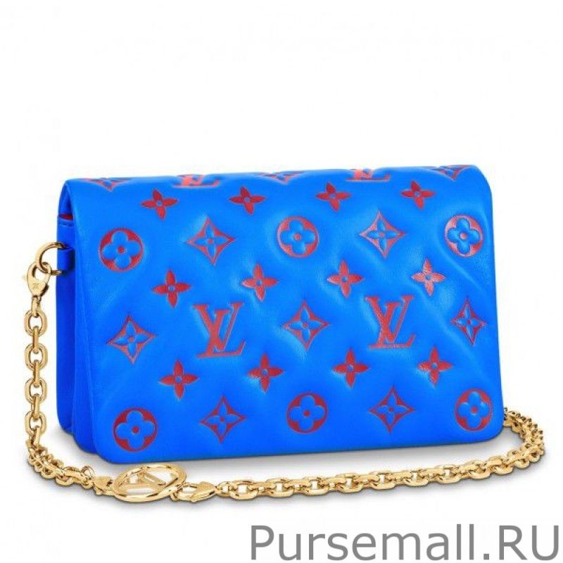 The Pochette Coussin is crafted from soft lambskin, which is embossed with the Monogram pattern to create a puffy, cushiony effect. This is further enhanced by the construction of the pouch, which gives it a supple, bodyfriendly shape. The removable chain, decorated with a charm, offers different carry options: clutch, shoulder or belt.