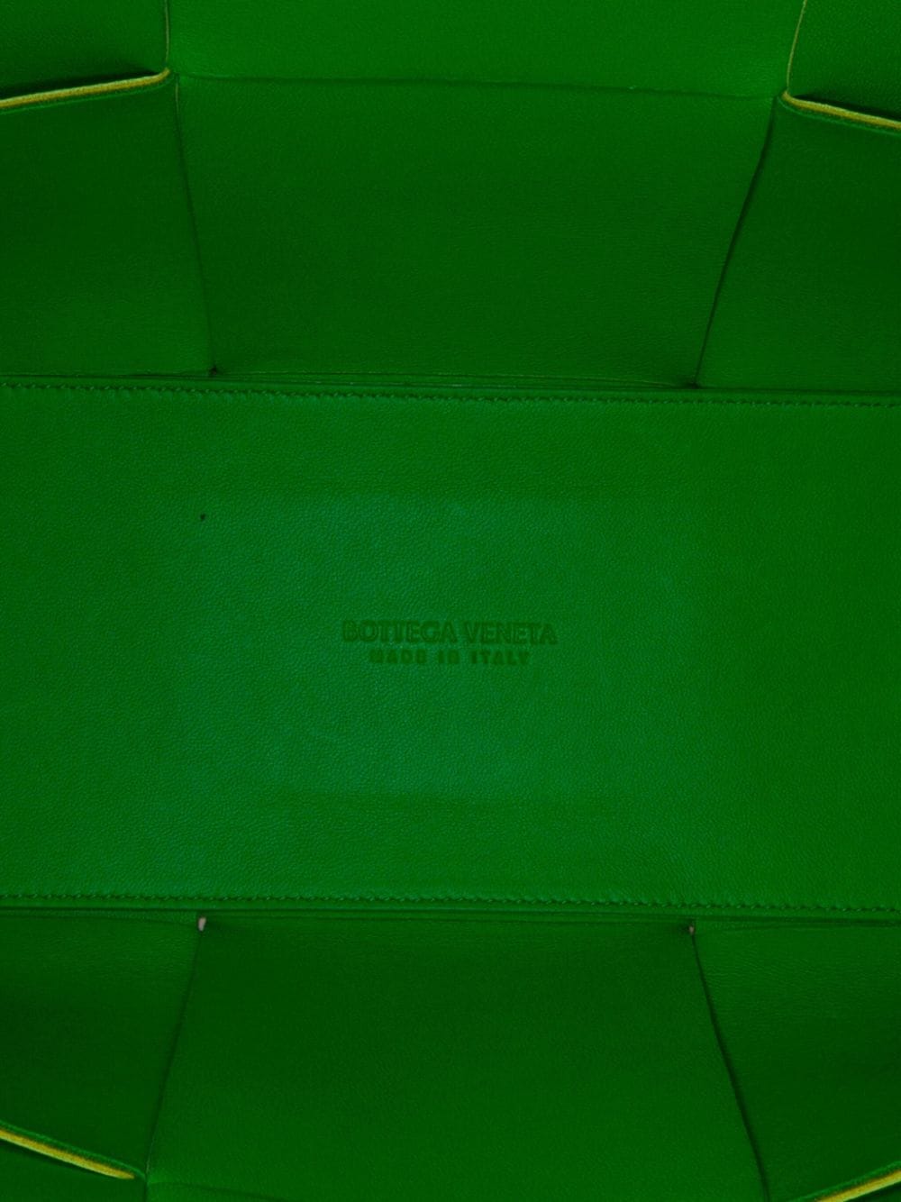 Created in the late ’60s, the Intrecciato — a weaving technique — became Bottega Veneta’s most distinguished design element. It’s seen on this small Arco tote bag, in a Maxi iteration, which is rendered in lime-green calf leather for a statement, zingy look.