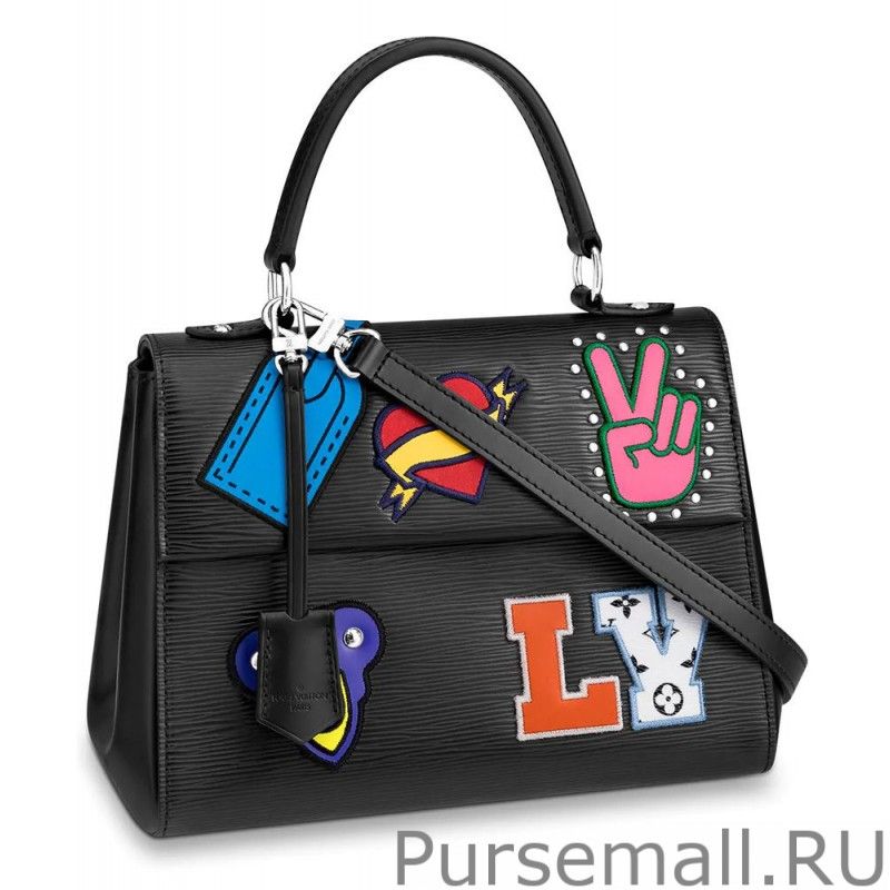 Epi grained cowhide leather, smooth cowhide leather, and Monogram canvas patches and studs