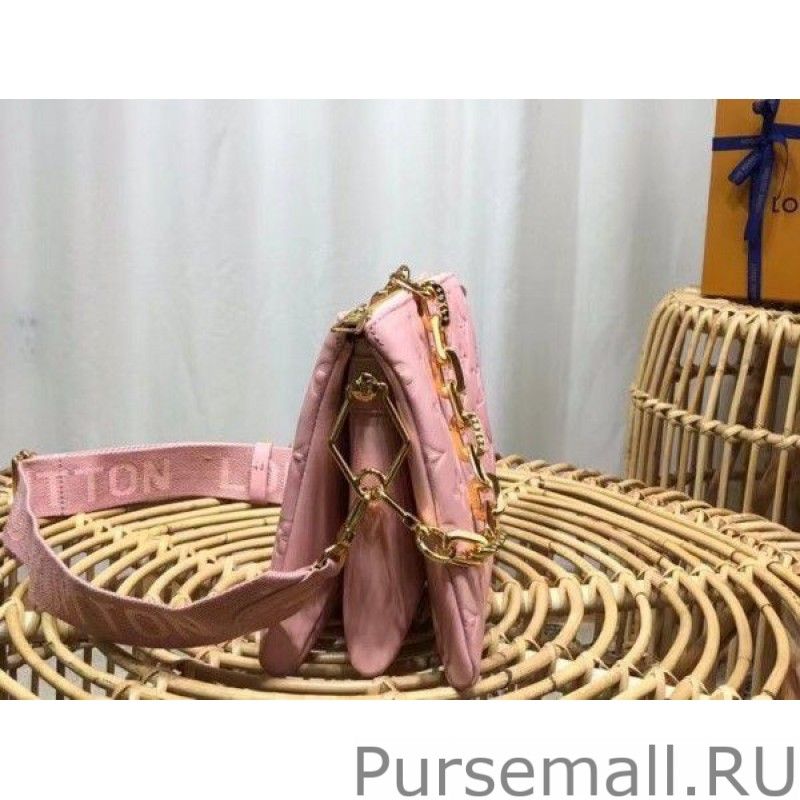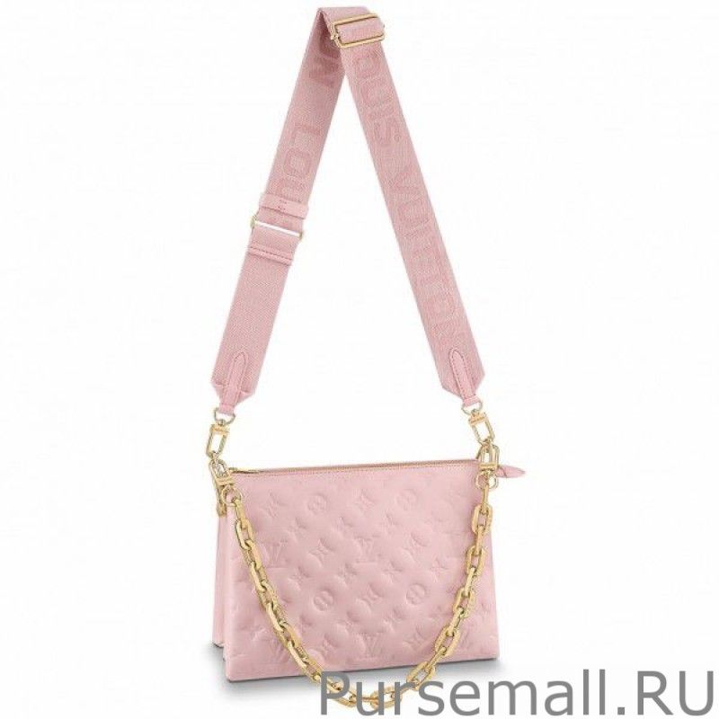 Fashioned from puffy lambskin and accessorized with a chunky goldcolor chain, this Coussin PM handbag is part of the Vuittamins capsule collection. Its bright vibrant colorway is Nicolas Ghesquière’s translation of the joy and audacity of women. The Coussin can be worn crossbody with the strap, as a chain baguette, or carried under the arm.