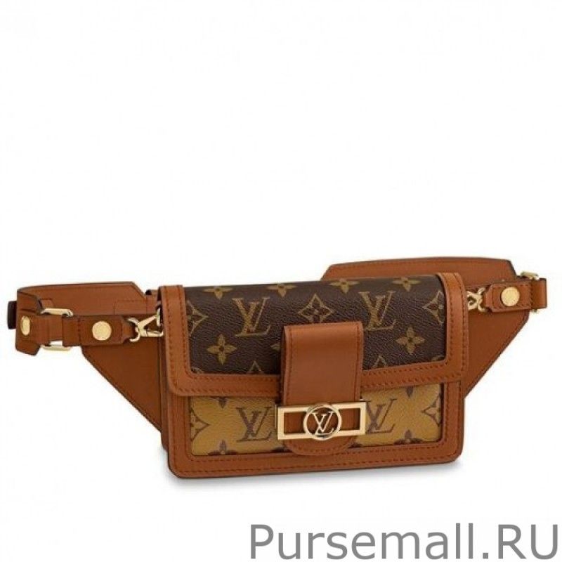 The Dauphine bumbag in Monogram and Monogram Reverse canvas combines a neo-vintage aesthetic with an utterly modern function. Its adjustable leather belt allows it to be worn around the waist or across the body. With the strap removed, it becomes a clutch. The two-tone canvas combination is complemented by gold-color hardware.