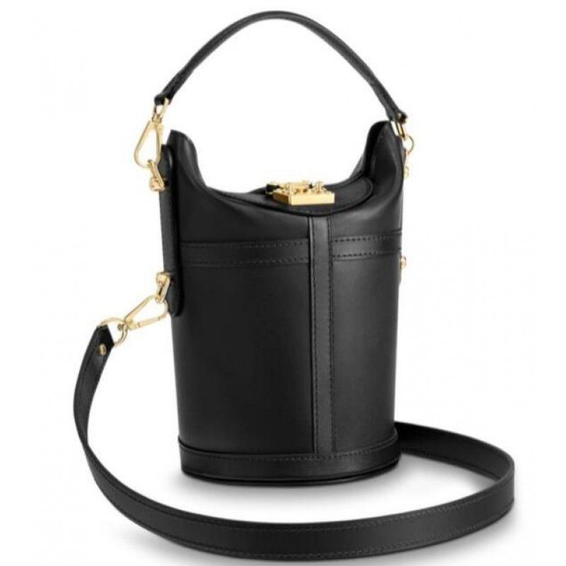 Nicolas Ghesquiere revisited the classic bucket shape for SS 18 and the result is the Duffle, a collectible jewel of a daytoevening bag. Fashioned of black Cuir Orf猫vre calf, it features a finely wrought SLock and a removable strap for overtheshoulder wear.