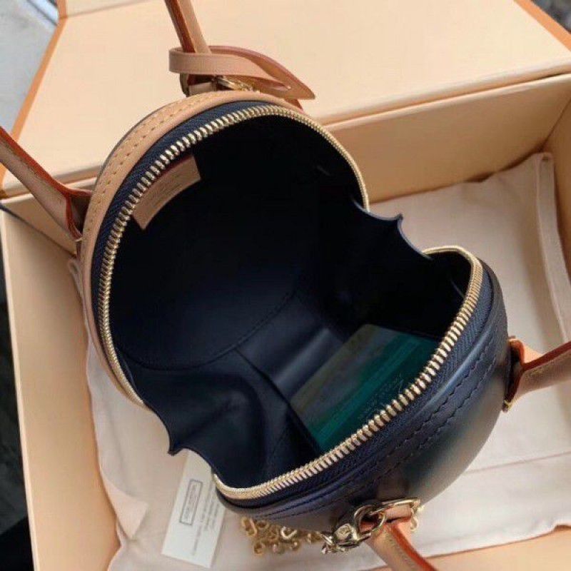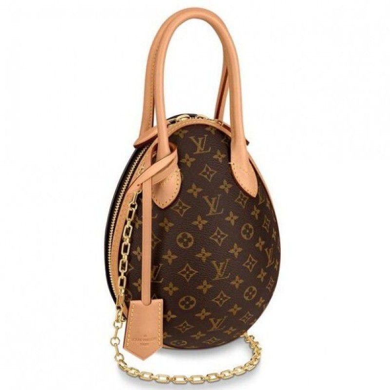 The LV Egg bag designed by Nicolas Ghesquiere caused quite a stir at the SpringSummer 2019 show. This model in timeless Monogram canvas and black calf is thermoformed to achieve the ohsochic ovoid shape. Trimmed with VVN cowhide, this fashionforward piece also features a mini chain strap and can hold an iPhone X.