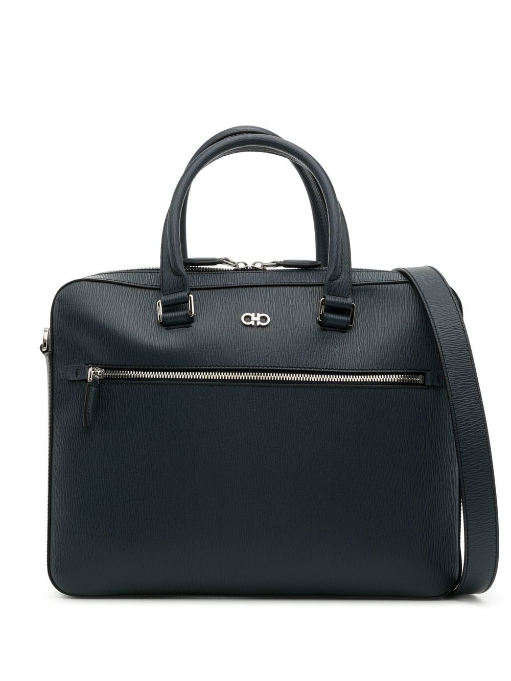 Gancini leather business bag from Ferragamo featuring midnight blue, leather, Gancini plaque, top zip fastening, main compartment, internal zip-fastening pocket, front zip-fastening pocket, two rolled top handles and adjustable detachable shoulder strap.