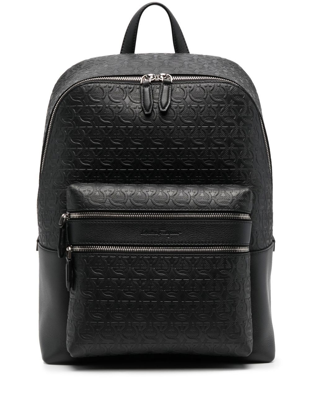 leather logo-embossed backpack from SALVATORE FERRAGAMO featuring black, leather, all-over embossed logo print, adjustable shoulder straps, all-around zip fastening, single rounded top handle and front zip-fastening pocket.
