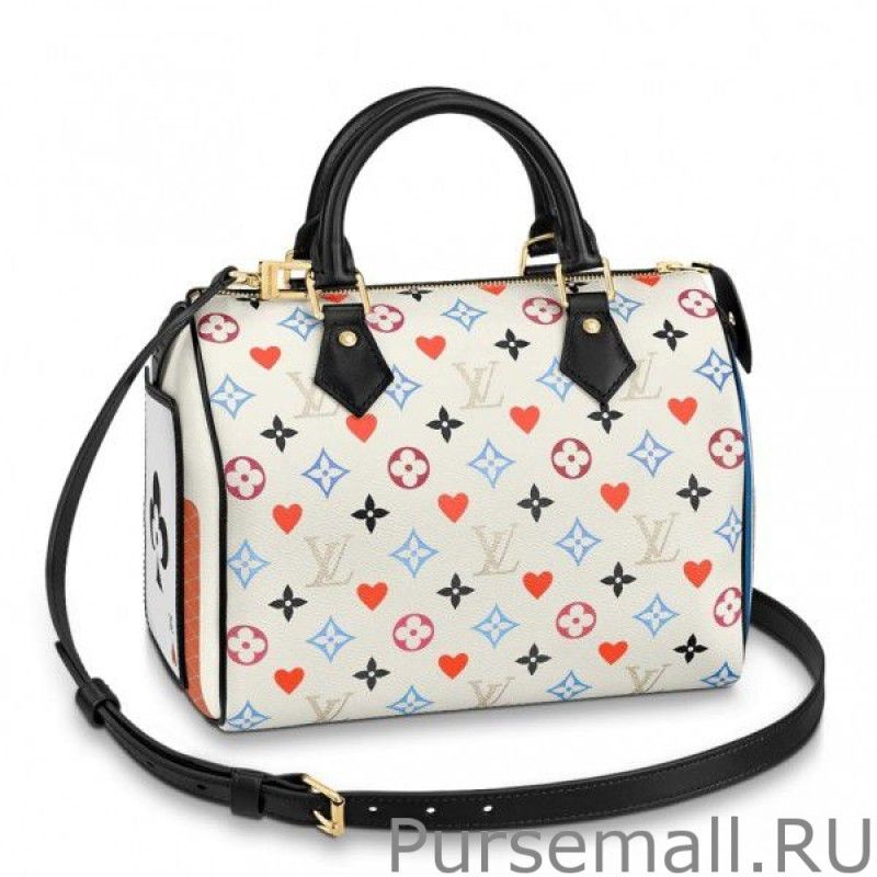 Taking inspiration from playing cards, Nicolas Ghesquière creates a bold bright version of the Monogram motif for this Speedy Bandoulière 25 in canvas. The playing-card outside pocket on the end of the bag brings fun and functionality. The visual design delivers style, its versatile shape makes it a perfect everyday bag.