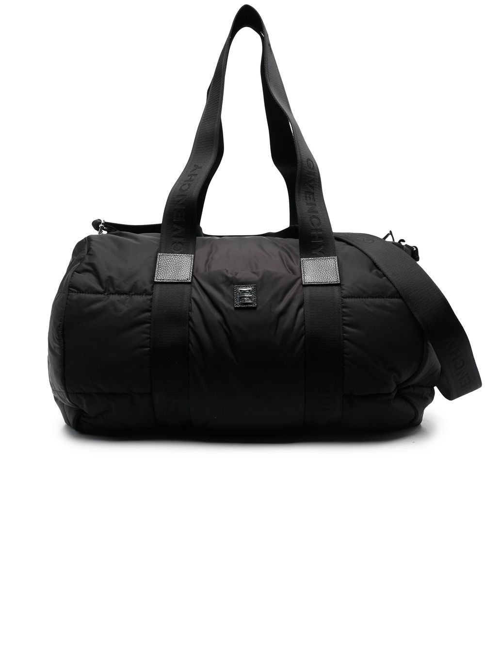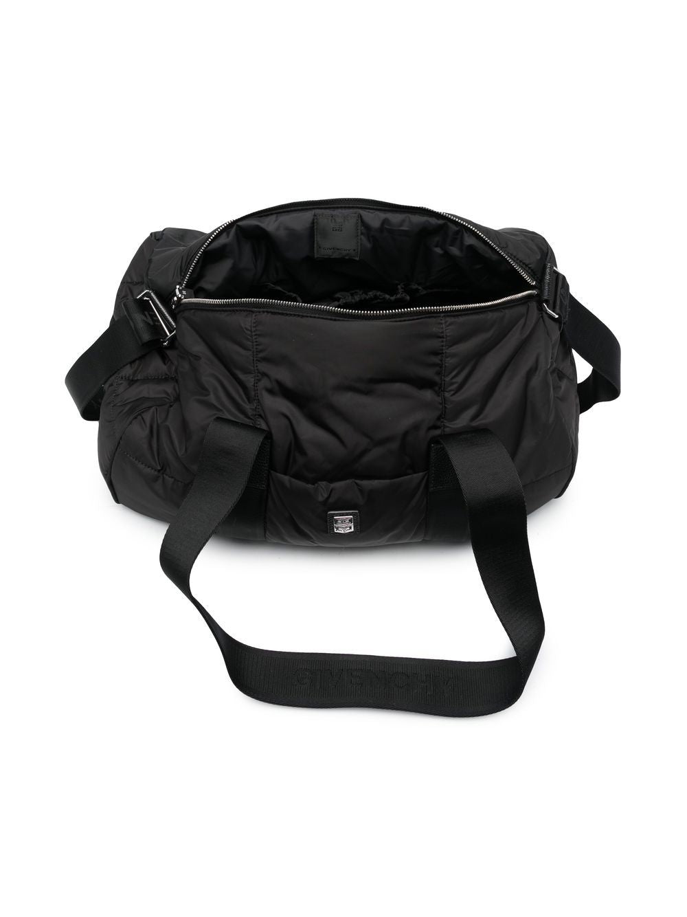 padded zipped baby changing bag from Givenchy Kids featuring black, leather trim, padded design, top zip fastening, two rounded top handles, single shoulder strap, main compartment, internal logo patch, internal slip pocket, full lining and changing mat.