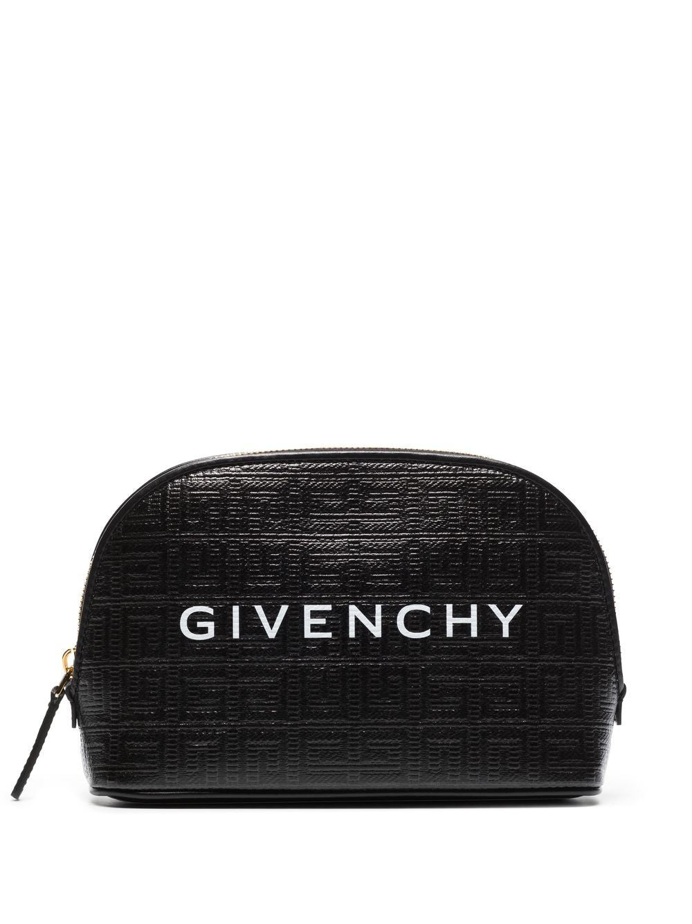 Givenchy’s clutch showcases the brand’s emphasis on refined elegance. This black iteration is embossed with the brand’s 4G motif and printed with the brand’s logo in contrasting white letters.