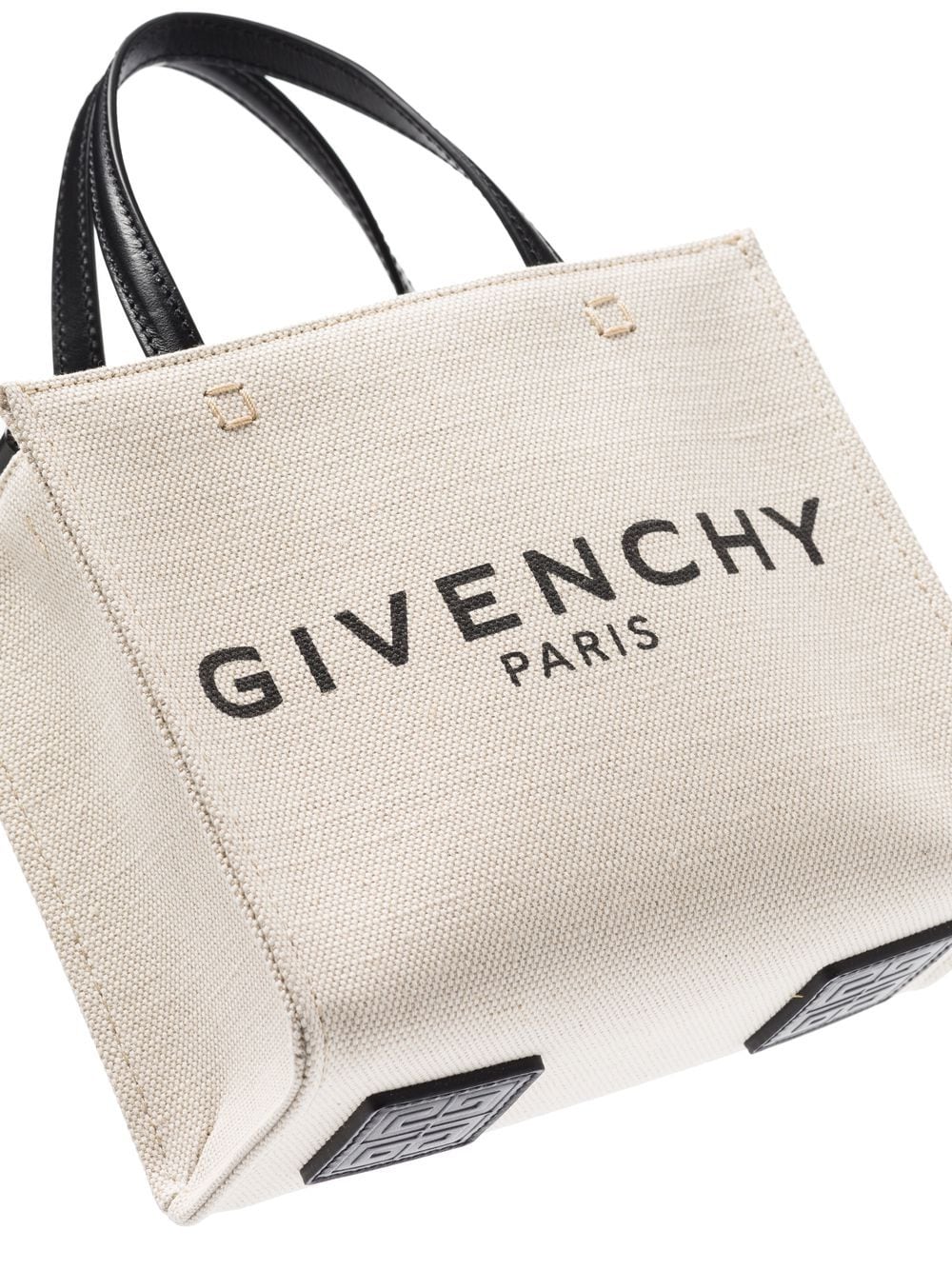 logo-print tote bag from GIVENCHY featuring off-white, jet black, leather, logo print to the front, logo-debossed patch to the rear, two top handles and main compartment.