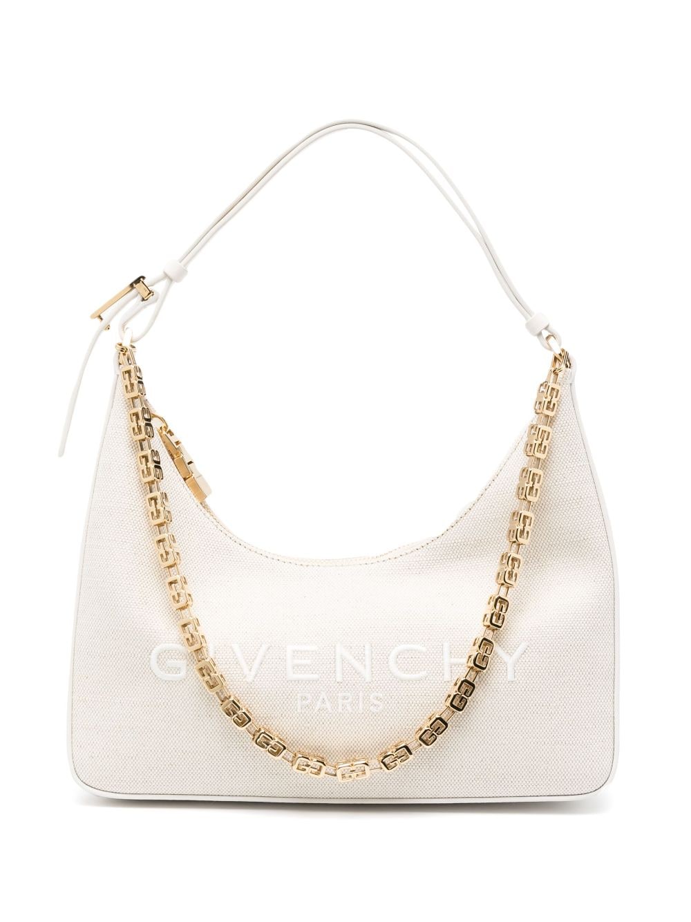 Introduced for the brand’s AW23 collection, the Moon Cut bag reflects Givenchy’s craftsmanship and modern take on classic silhouettes. Crafted in Italy from a linen blend, this beige shoulder bag is adorned with a G Cube chain that acts as a second strap and refined gold-tone hardware. A signature 4G motif can be found at the back.