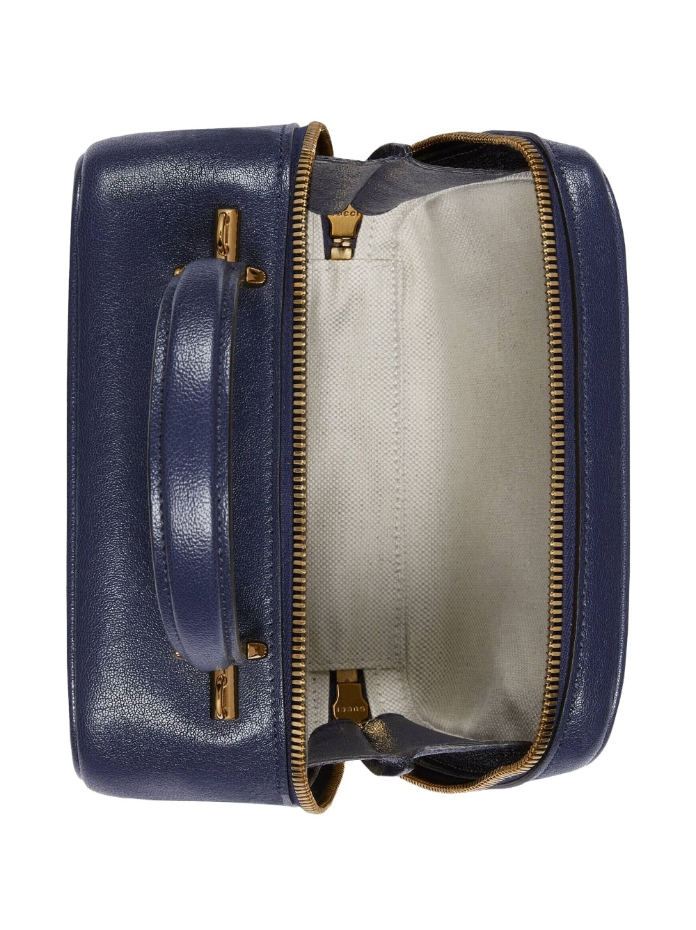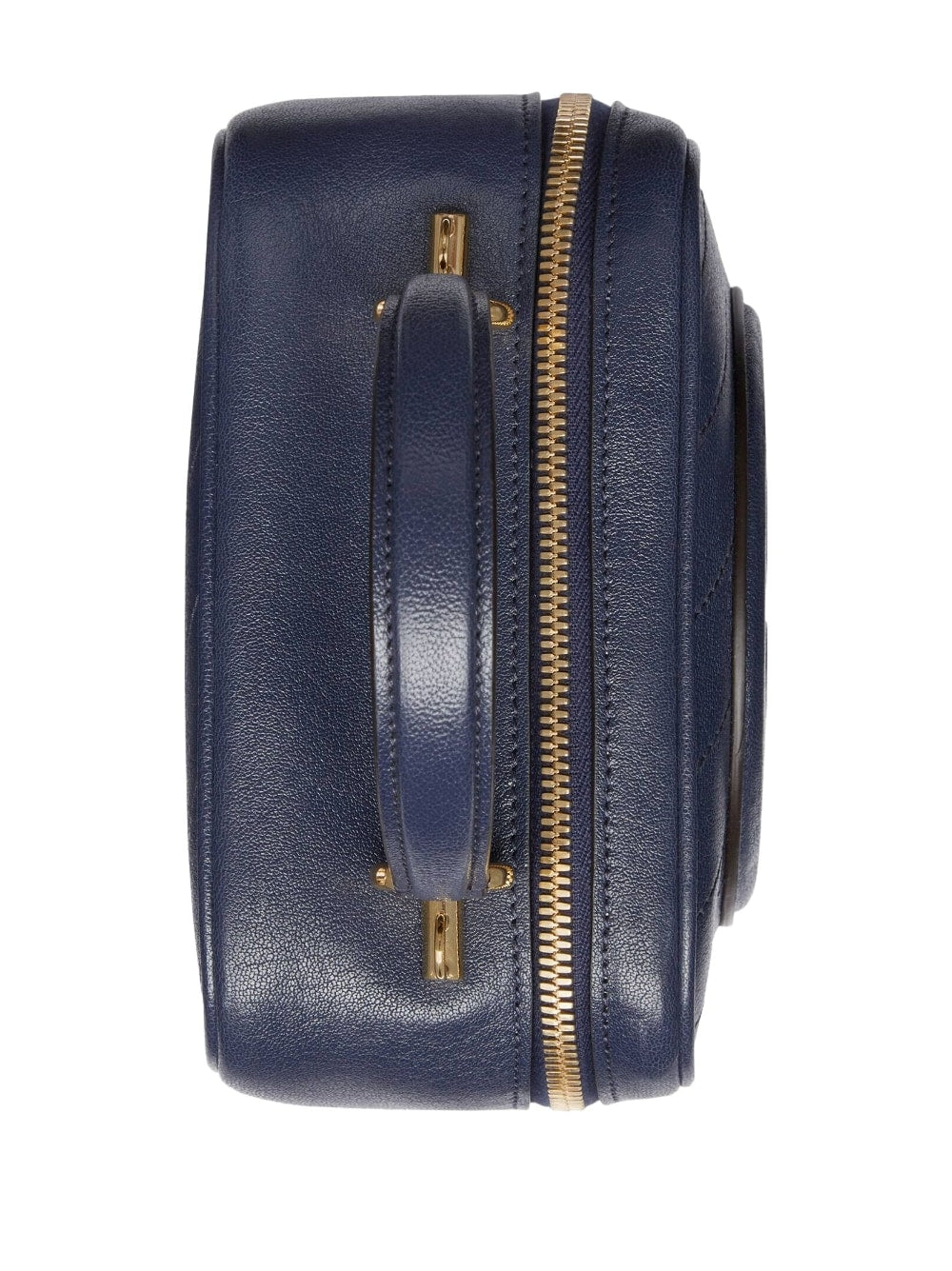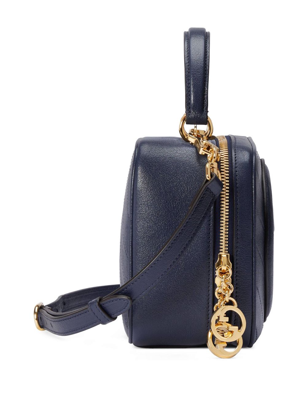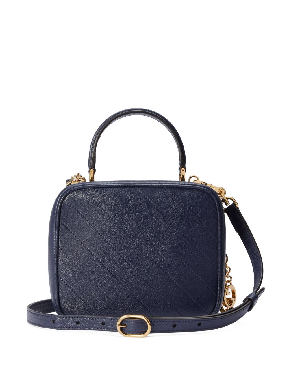 Blondie logo-patch tote bag from Gucci featuring navy blue, leather, gold-tone hardware, logo patch to the front, signature Interlocking G logo, single top handle, adjustable detachable shoulder strap, all-around zip fastening and main compartment.