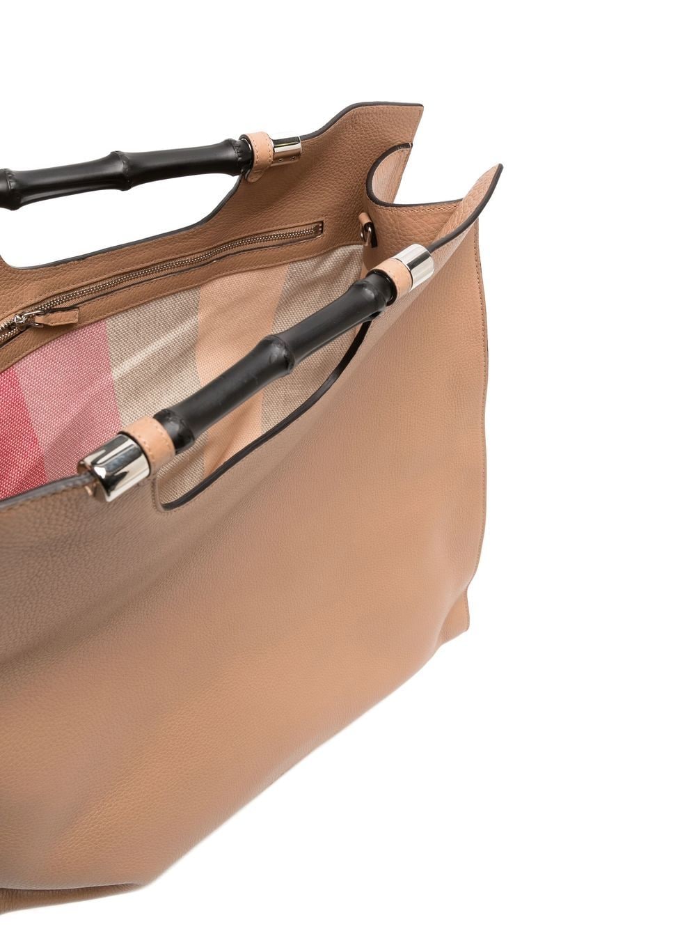 Decorated with the Italian fashion House’s debossed logo to the front, this tote bag by Gucci is imagined in a light brown hue. Crafted from grained leather, it features two wooden top handles.