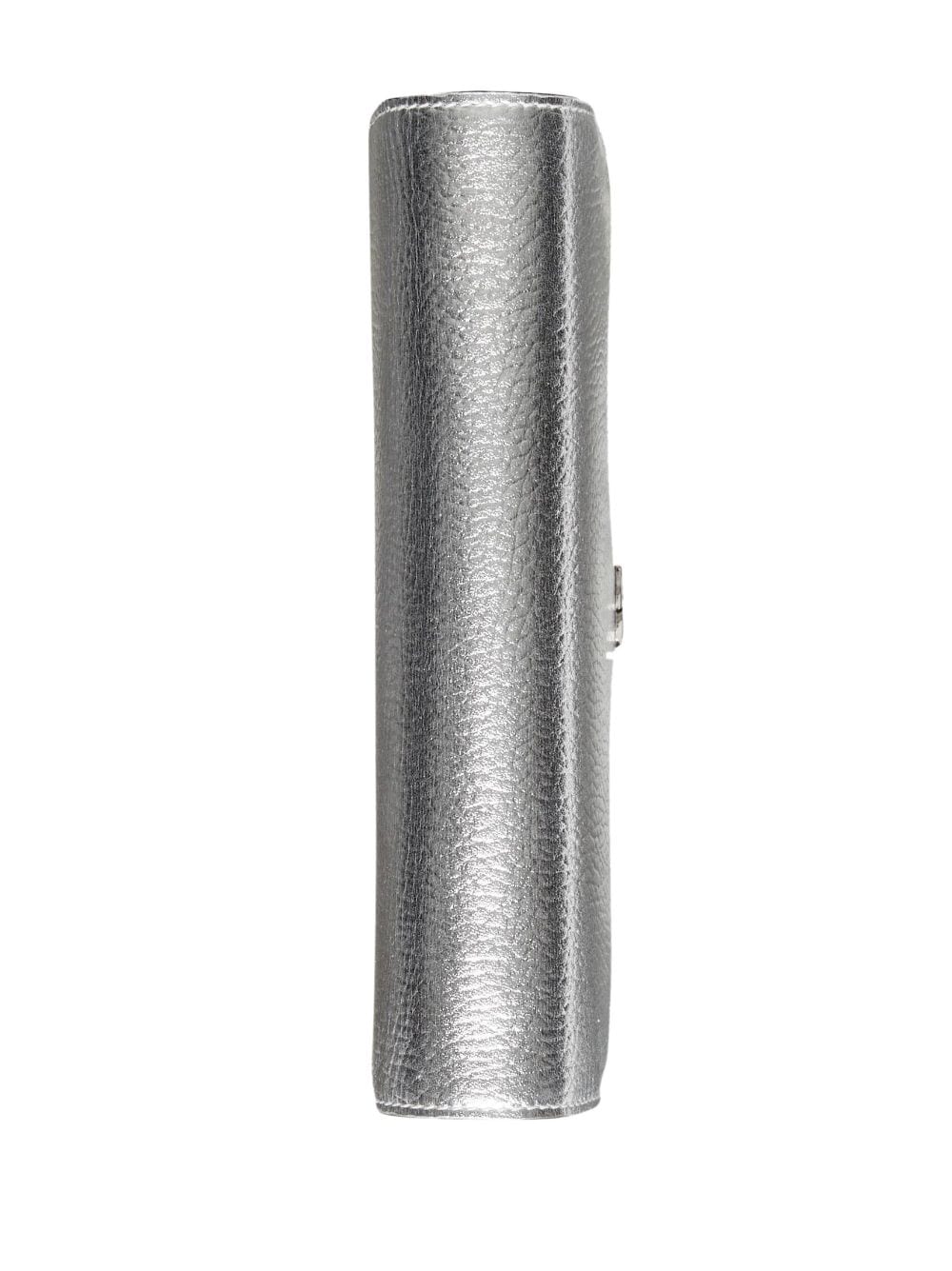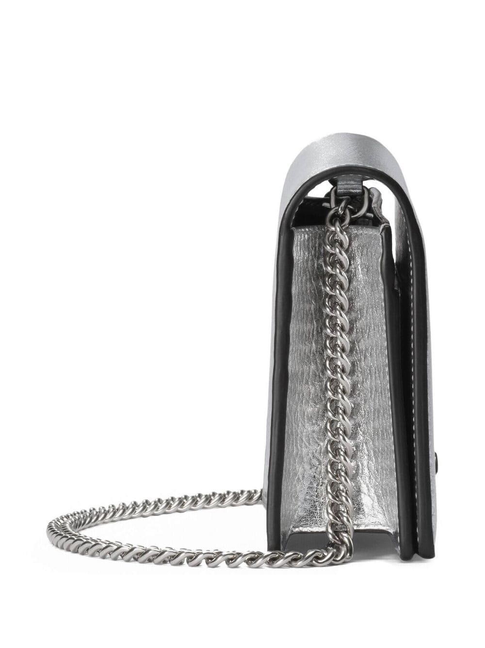 Crafted from metallic leather, this bag is an instantly recognisable Gucci item thanks to the Double G logo plaque that embellishes the front. The silver-tone design is suspended from a chain strap.