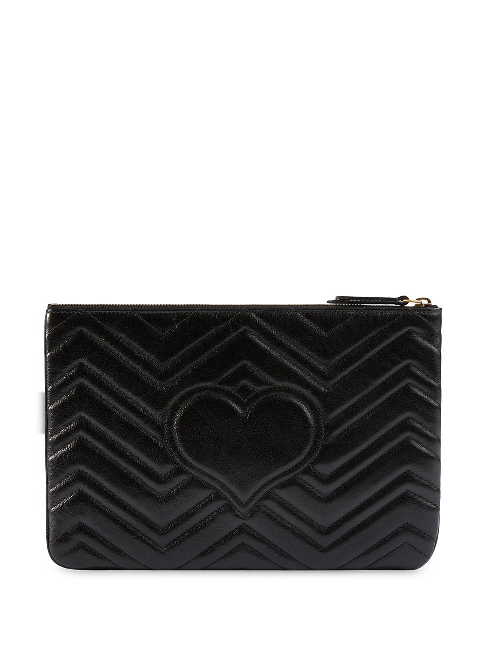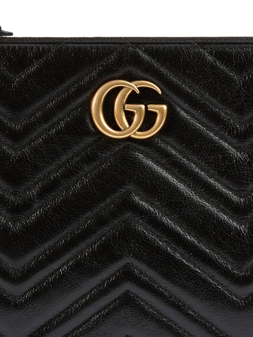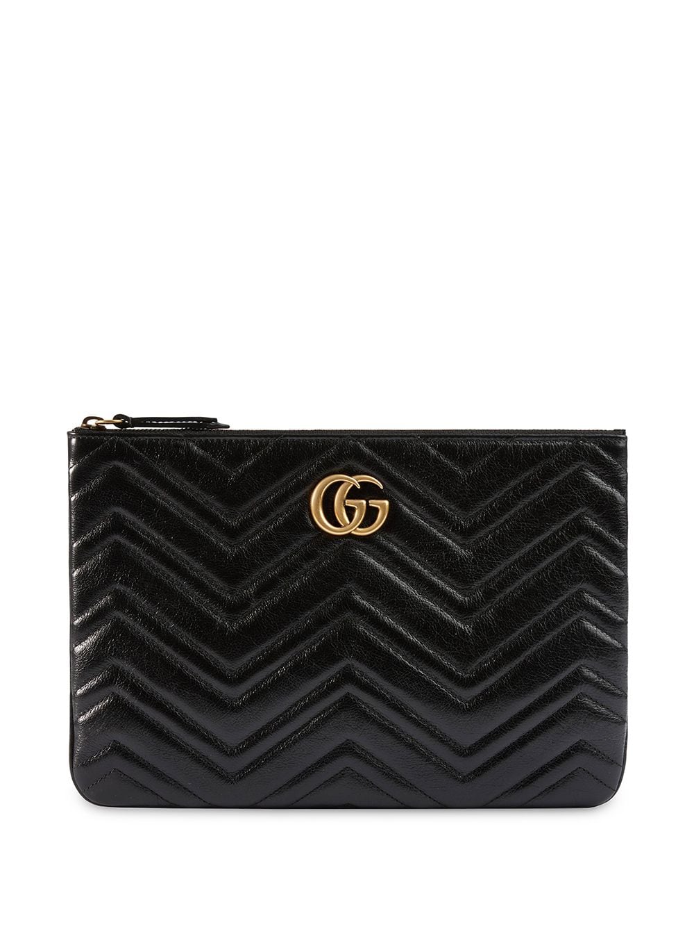 With every new collection, Gucci becomes more eclectic and unexpected. The creative director continues to transform the iconic Florentine fashion house, taking inspiration from his surroundings. This black leather GG Marmont clutch from Gucci features a gold-tone Double G logo plaque to the front, a quilted design, a top zip closure and an internal logo patch.
