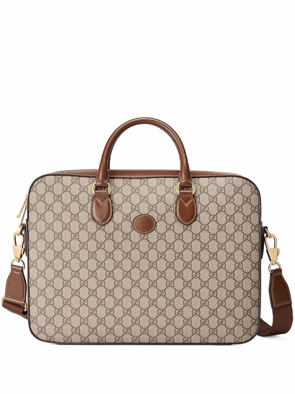 Boasting timeless appeal, Gucci’s Interlocking G logo plaque decorates the front of this zip-top laptop bag for SS22. Crafted from the label’s GG Supreme canvas, this practical piece is detailed with complimentary gold-tone hardware and contrast stitching.
