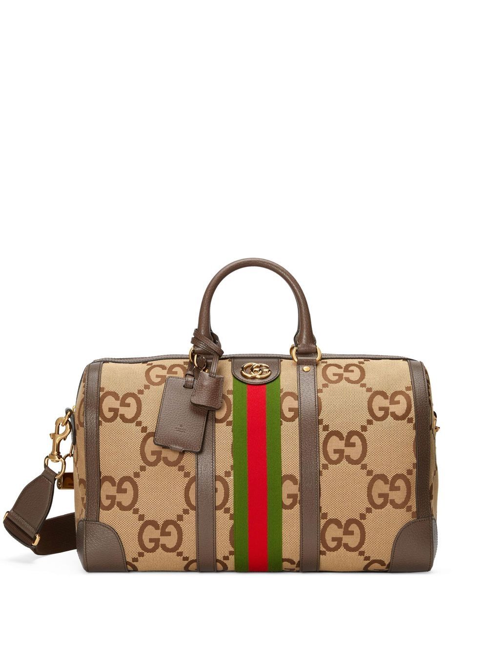 Jumbo GG duffle bag from Gucci featuring beige, multicolour, cotton, leather trim, gold-tone logo plaque, monogram pattern, leather top handles, adjustable detachable shoulder strap, top zip fastening and main compartment.