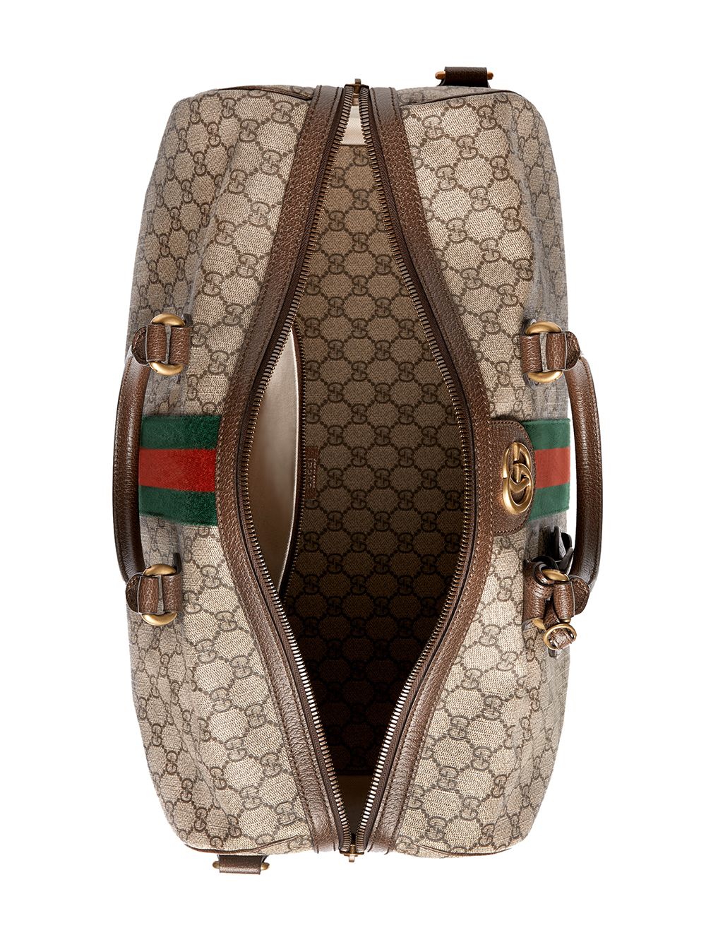 The world of Ophidia evolves with the introduction of a duffle shape crafted in soft GG Supreme canvas with inlaid green and red Web stripe. A contemporary take on a Gucci archival belt buckle from the ’70s, the Double G is repurposed and appears atop a textured leather tab detail. The carry-on is completed with a detachable and adjustable strap, lock with key holder and luggage tag.
