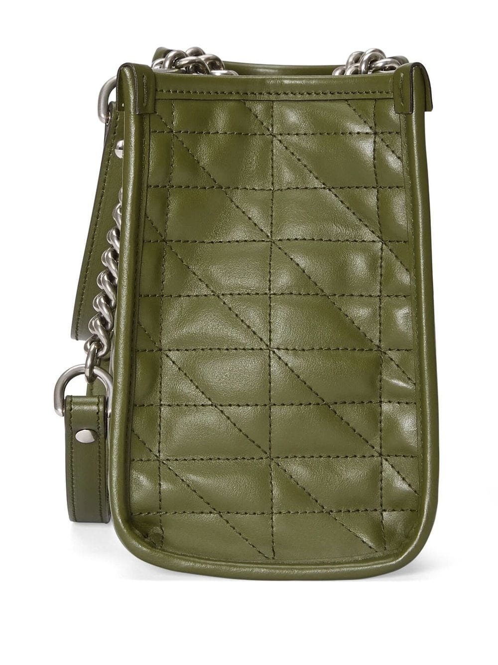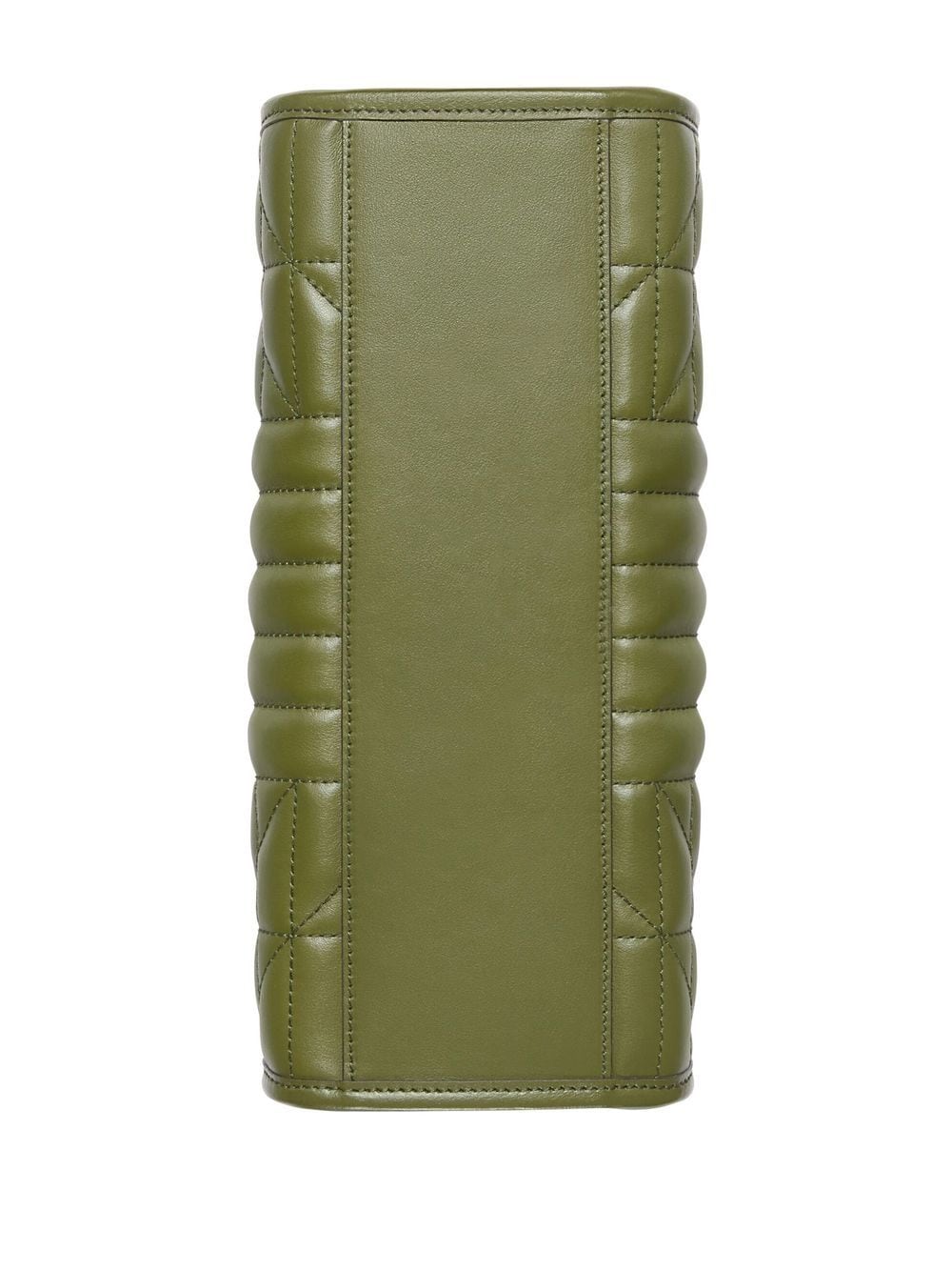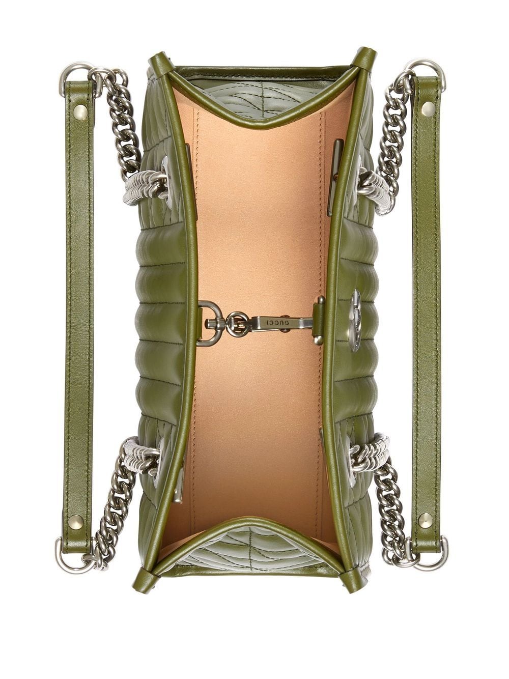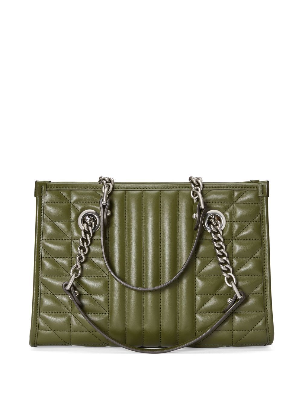 Diving into the Italian House’s archives, the Gucci Aria SS22 collection offers a reimagining of some of the brand’s most emblematic signature styles with added contemporary elements. This small iteration of the GG Marmont tote bag is quilted with the classic matelassé effect in a new geometric take of mixed diagonal and vertical lines. The emblematic interlocking G logo appears in a silver tone against the green leather, matching the chain-link shoulder straps.