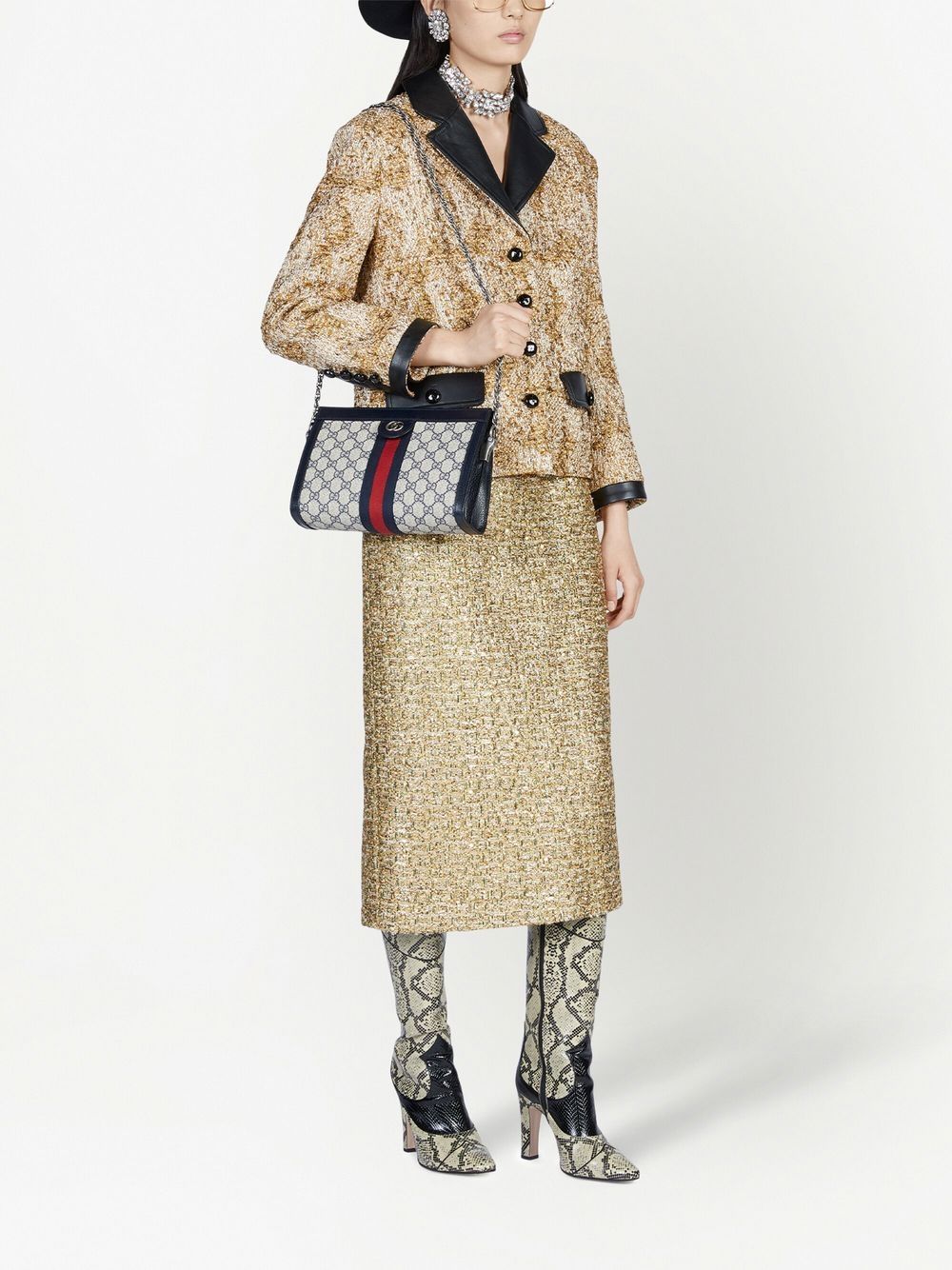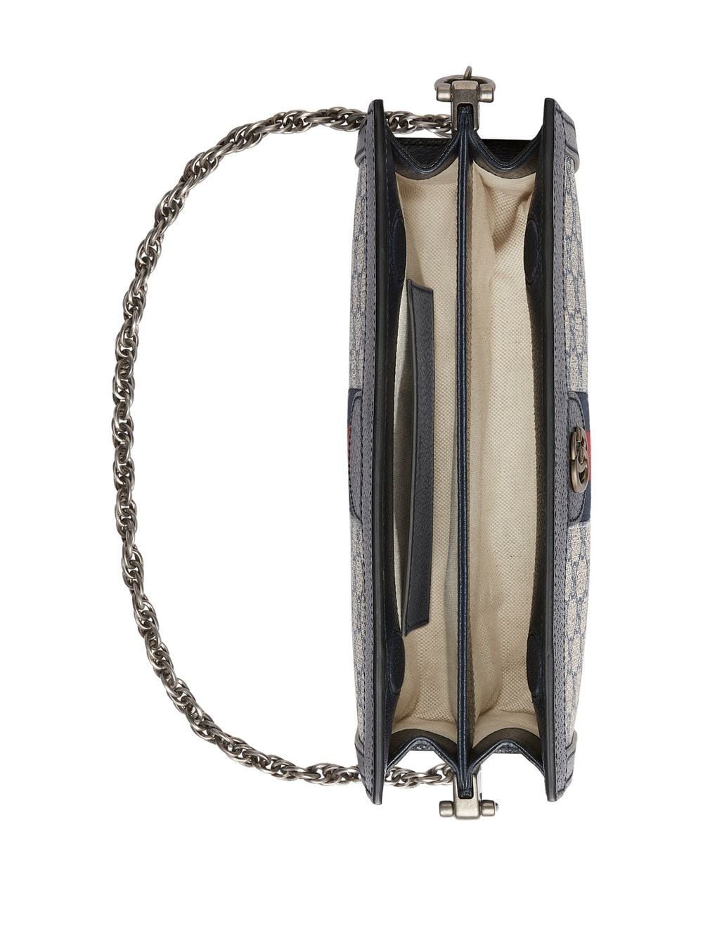 A renowned silhouette of the house, the Ophidia draws inspiration from Greek mythology and is adorned with some of Gucci’s most iconic motifs, like its GG Supreme canvas throughout and a GG logo plaque at the front. Trimmed with soft leather, this small bag is finished with a navy and red iteration of the brand’s Web stripe motif and can be worn at the shoulder or across the body thanks to its adjustable chain-link strap.