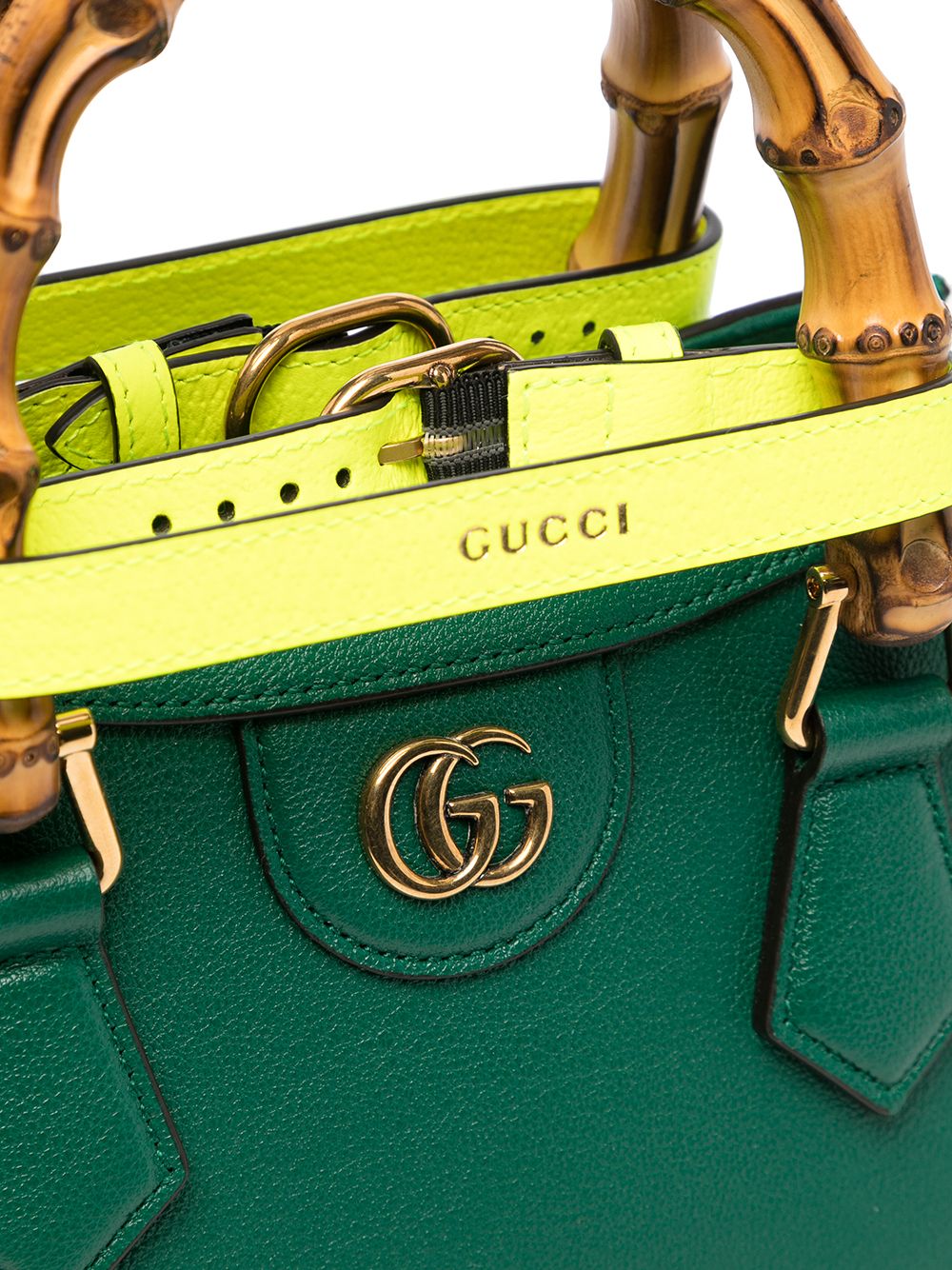 Gucci’s Diana tote honours two of the brand’s most iconic motifs – the Double G logo and bamboo top handles. This emerald iteration features neon yellow buckles around each one.