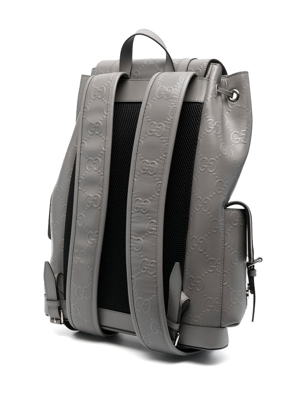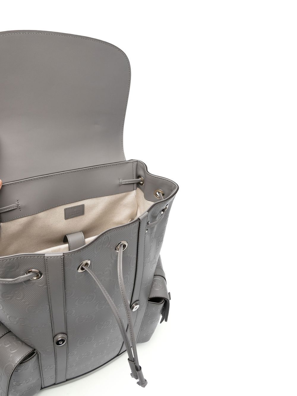 Grigio, pelle di vitello, stampa all-over con logo goffrato, chiusura ad alamaro, manico ad anello, chiusura con doppia fibbia e due tracolle regolabili.