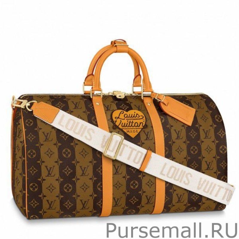 The classic Keepall Bandoulière 50 travel bag gets a makeover under the auspices of Virgil Abloh and Japanese designer Nigo as part of the NIGO® x capsule collection. Made of Monogram Stripes Brown canvas, with the Monogram pattern on a striped background, it features a wide removable strap with an embroidered “Louis Vuitton”.