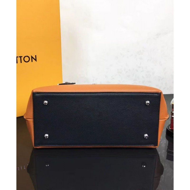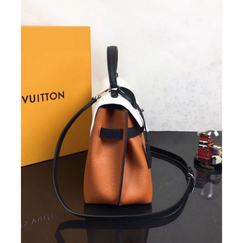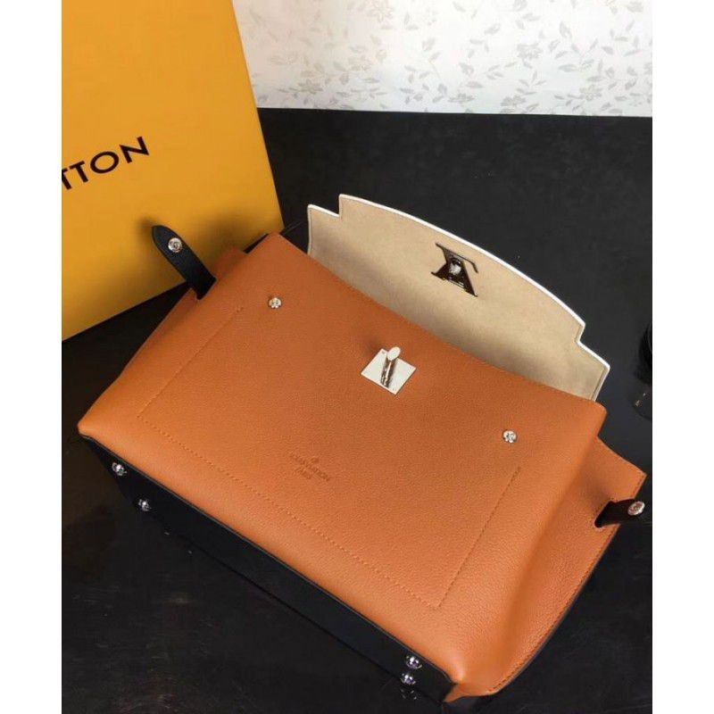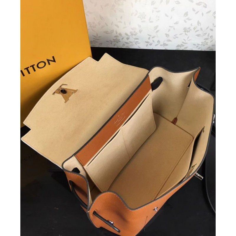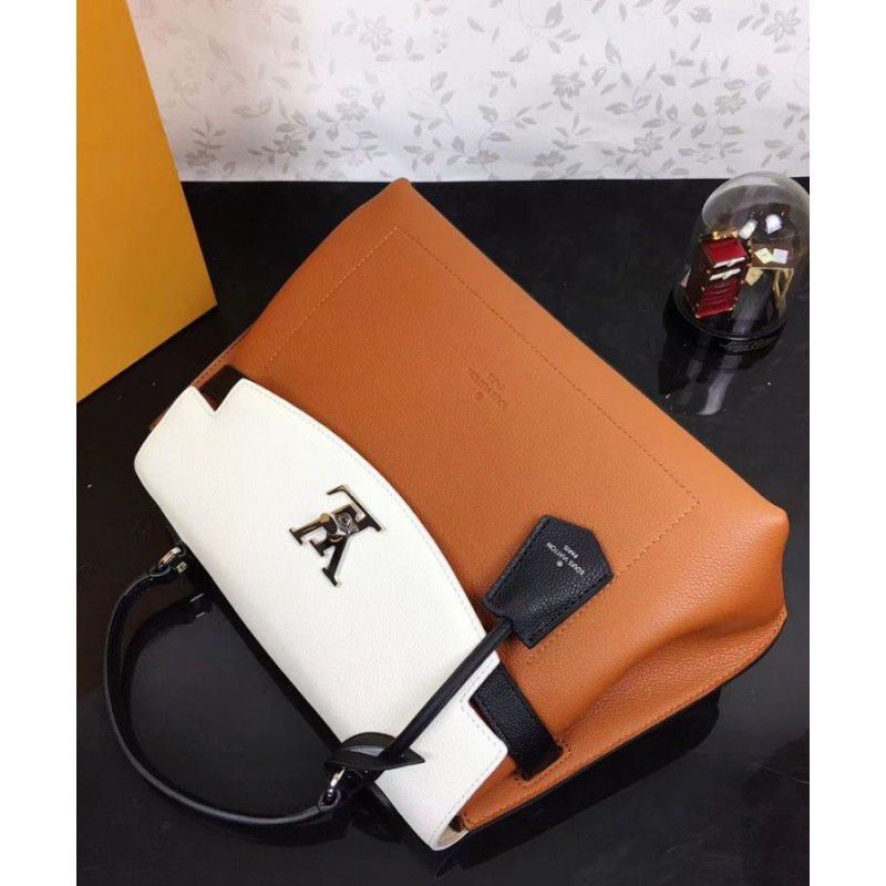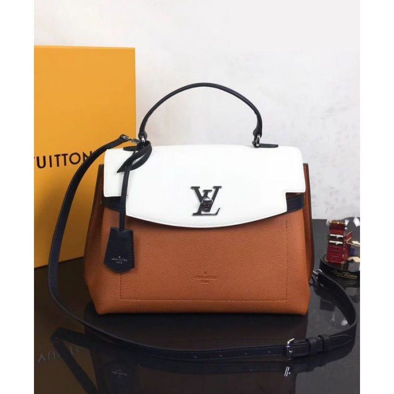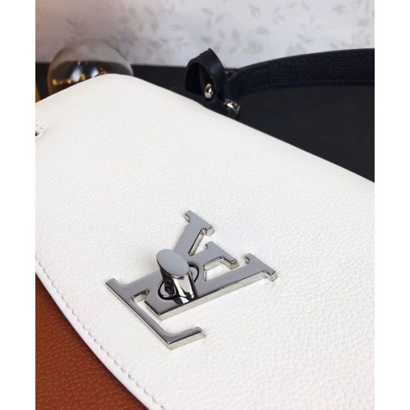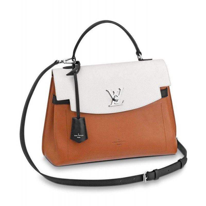 The onehandle Lockme Ever model in soft calfskin sports a sleek, structured shape. The graphic lines of the top flap give this supple, roomy bag a modern attitude. Accented with a silverfinish LV turn lock and furnished with a leather strap for handsfree ease, it is an elegant choice for daily wear.