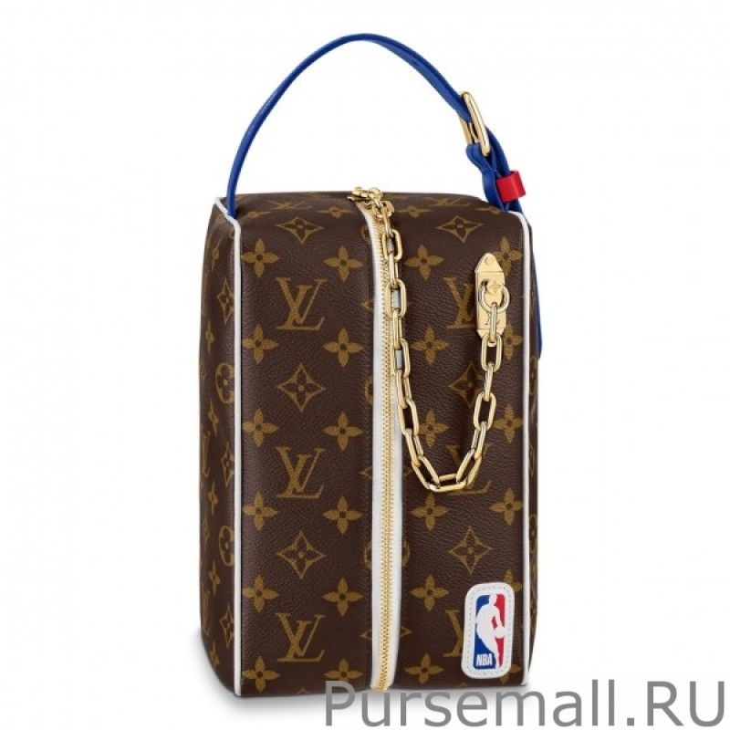 The glamourous Cloakroom Dopp Kit bag is Virgil Abloh love letter to the NBA. Made from iconic Monogram coated canvas, it finished with an NBA patch, a lining in NBA blue, as well as an adjustable leather handle also in NBA blue. The gold-color chain evokes the league championship trophy.