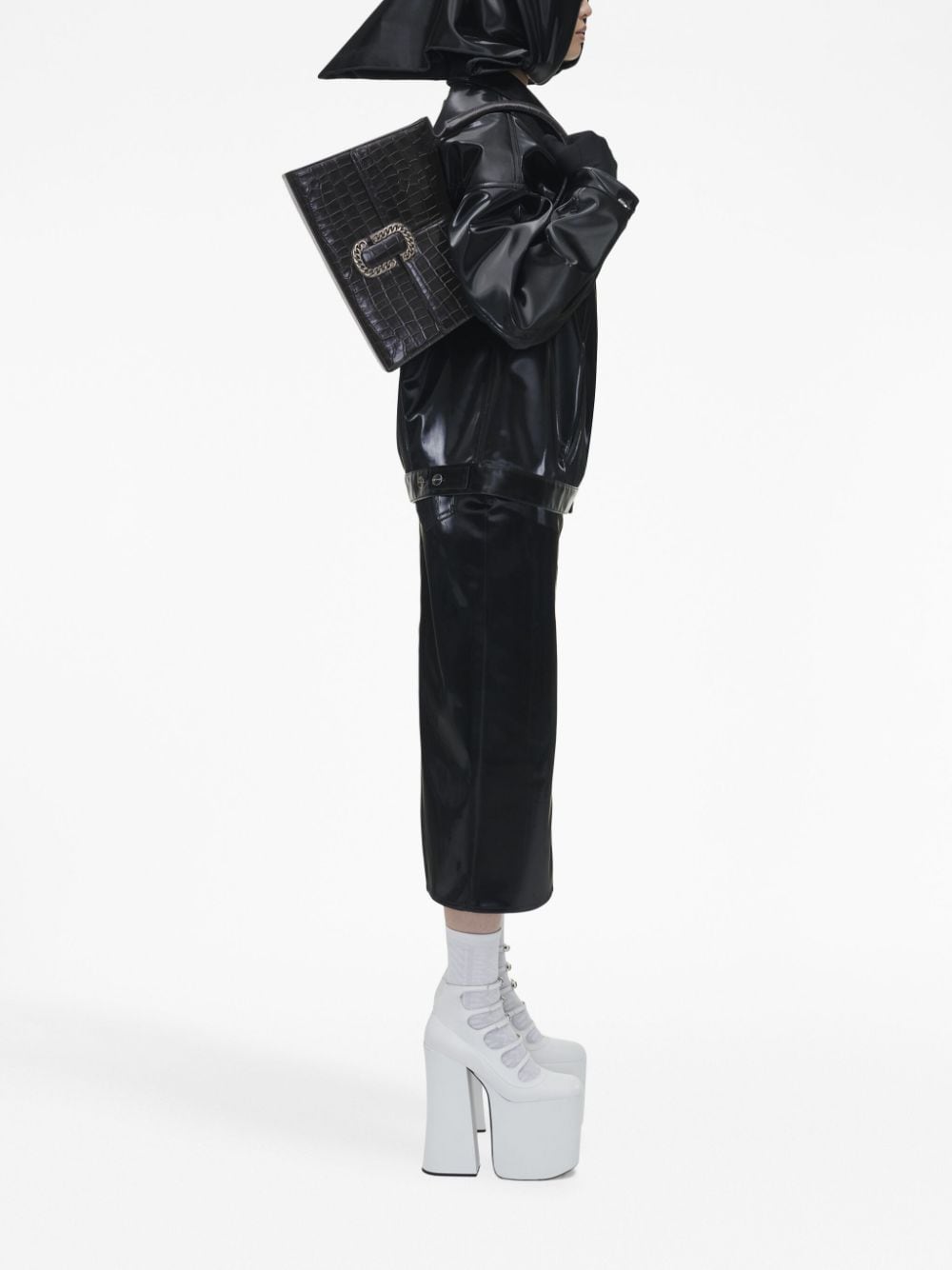 • A signature style, The St. Marc tote bag by Marc Jacobs is back for the new season in black. Crafted from croc-embossed leather, this model is defined by an ‘M’ shape adorned by a chain link J Marc hardware at the front.
