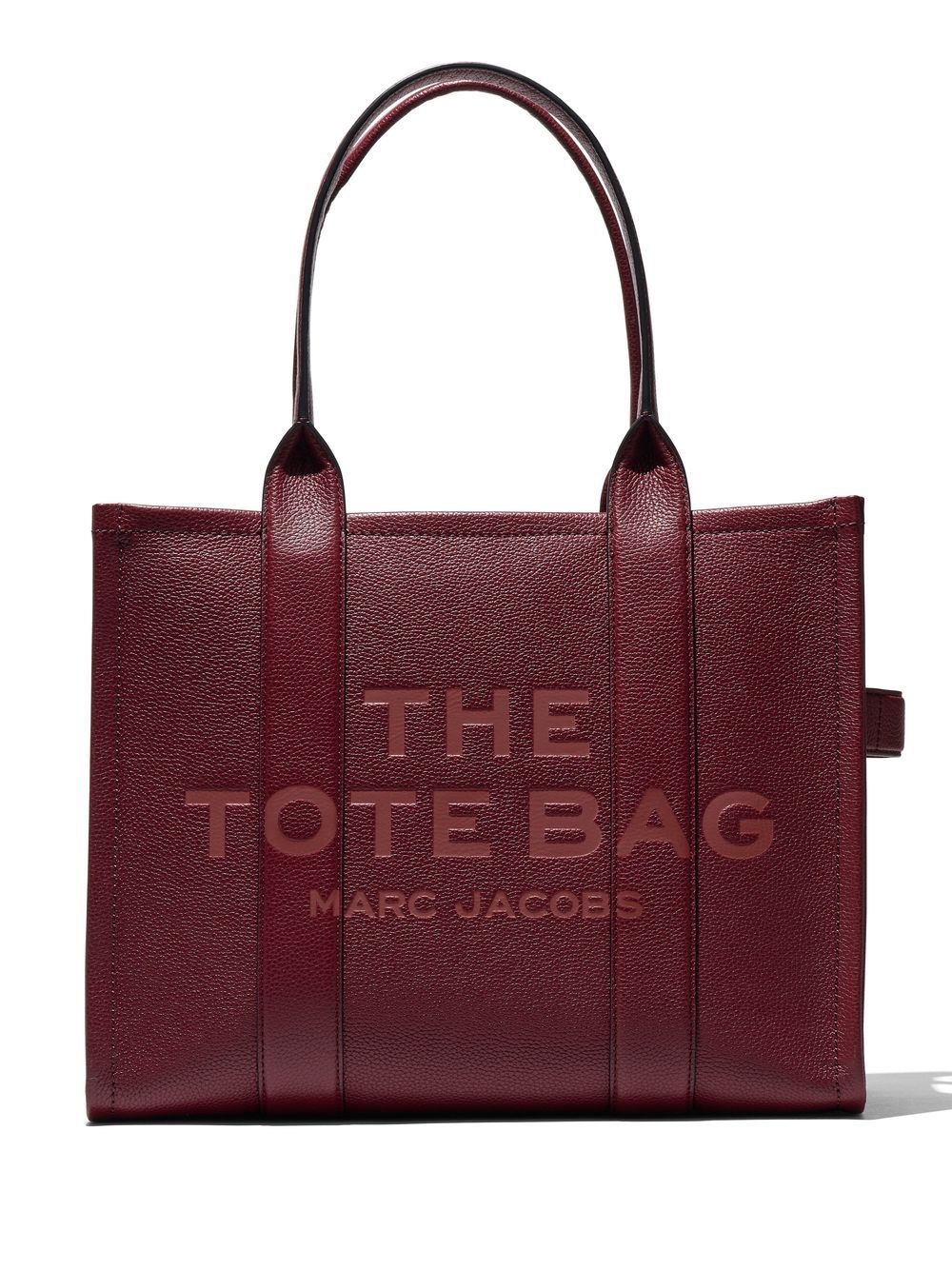 The Leather Large Tote bag from Marc Jacobs featuring wine red, calf leather, two rounded top handles, tonal stitching, pebbled texture, embossed logo to the front, top zip fastening, main compartment and internal patch pockets.