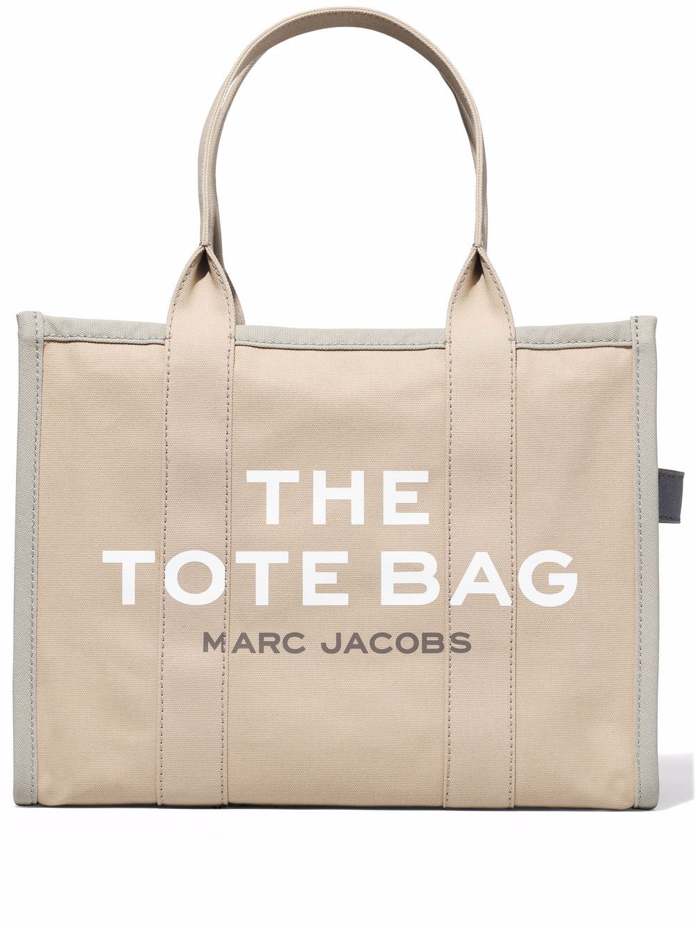 Beige/grey cotton The Large Tote bag from Marc Jacobs featuring colour-block design, logo print to the front, two rounded top handles, top zip fastening, main compartment, internal slip pocket, logo patch to the rear and side strap.