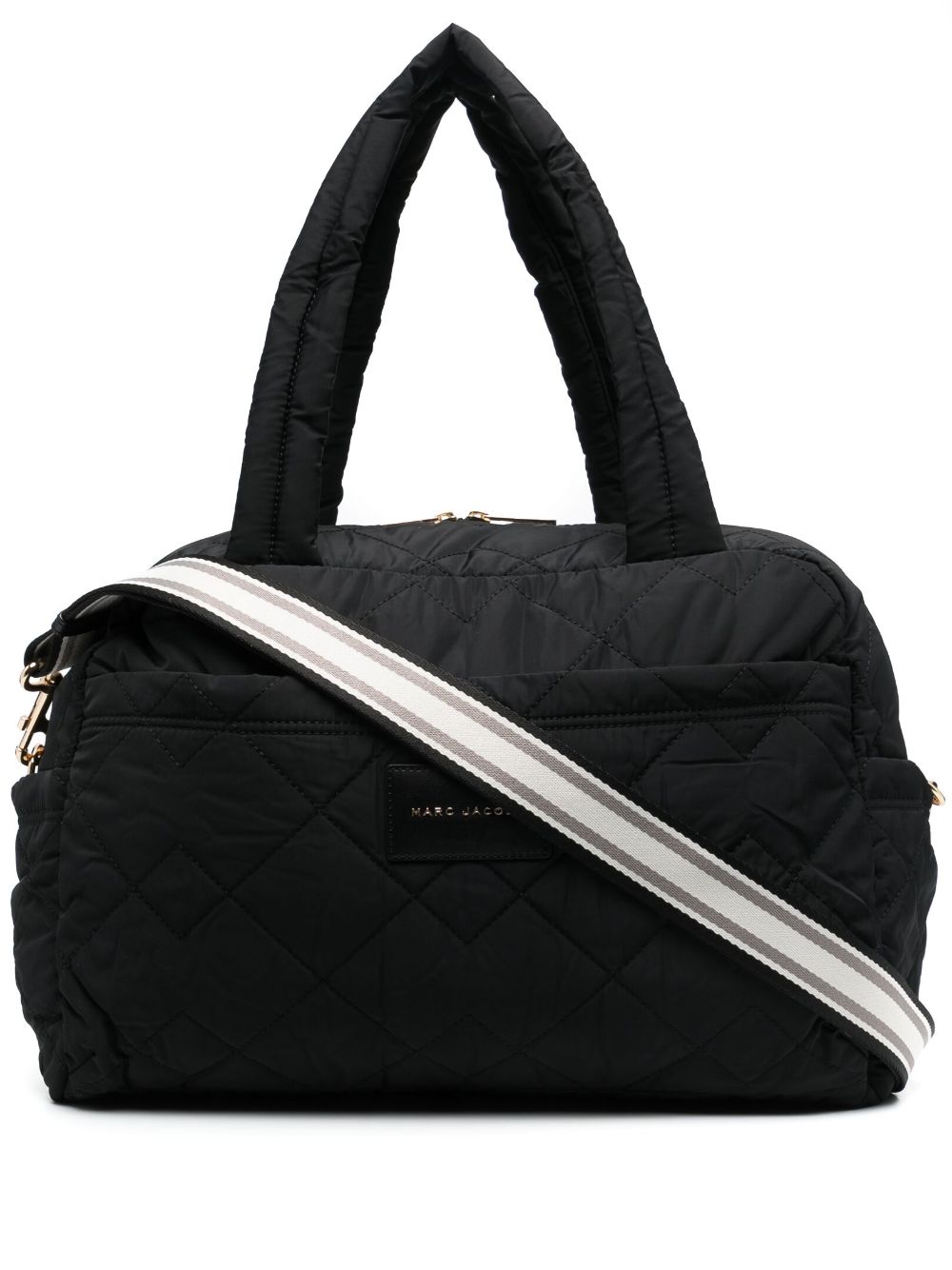 Black quilted luggage tote bag from Marc Jacobs featuring logo plaque, top zip fastening, two long top handles and adjustable shoulder strap.