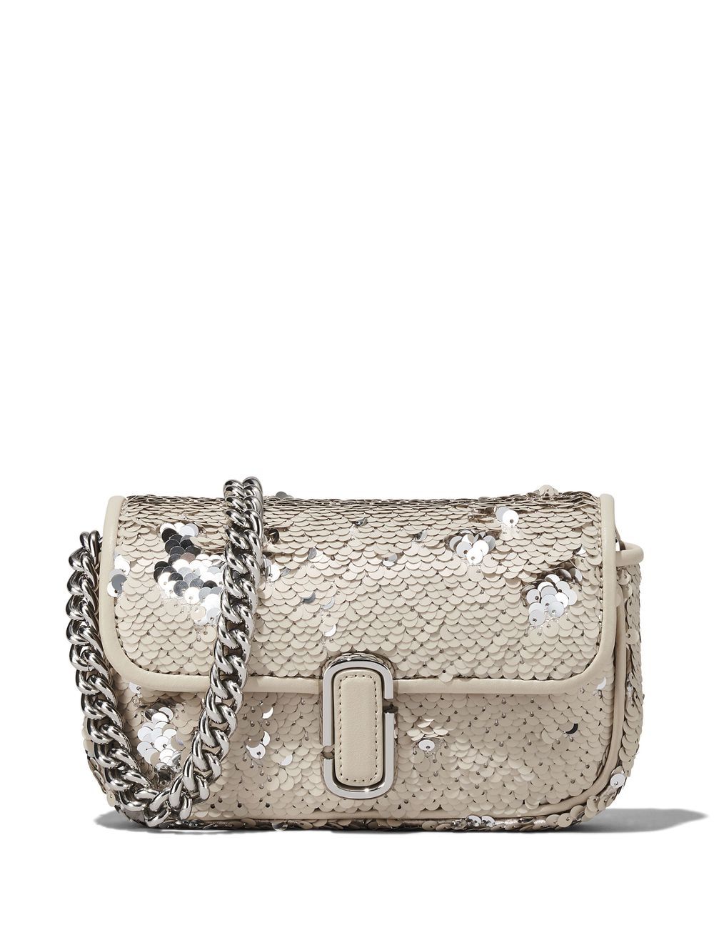 Covered in matte sequins for a three-dimensional finish, this mini iteration of the J Marc shoulder bag highlights Marc Jacobs’ play with texture and proportions for SS23. Complete with silver-tone hardware, the accessory is elevated with a familiar plaque at the centre.