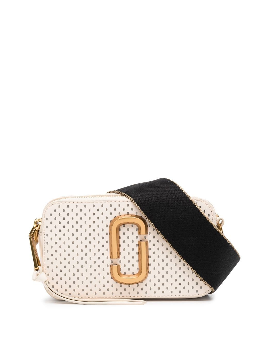 Tapioca leather Snapshot crossbody bag from Marc Jacobs featuring polka dot print, logo plaque, top zip fastening, slip pocket to the rear and single shoulder strap.