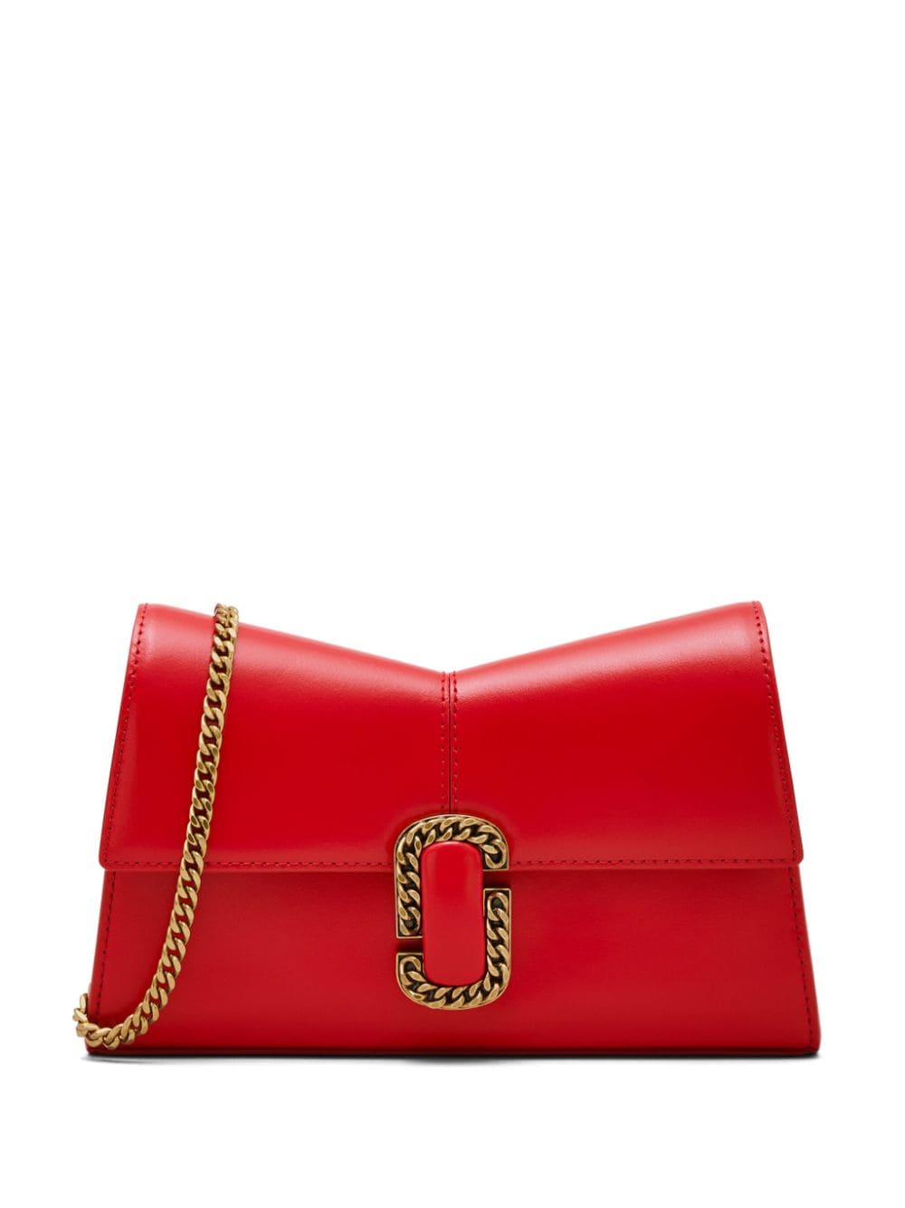 Marc Jacobs’ scarlet-red St. Marc Chain bag is crafted to a sculptural silhouette with signature double J hardware at the front traced with curb chain links to match the detachable shoulder strap.