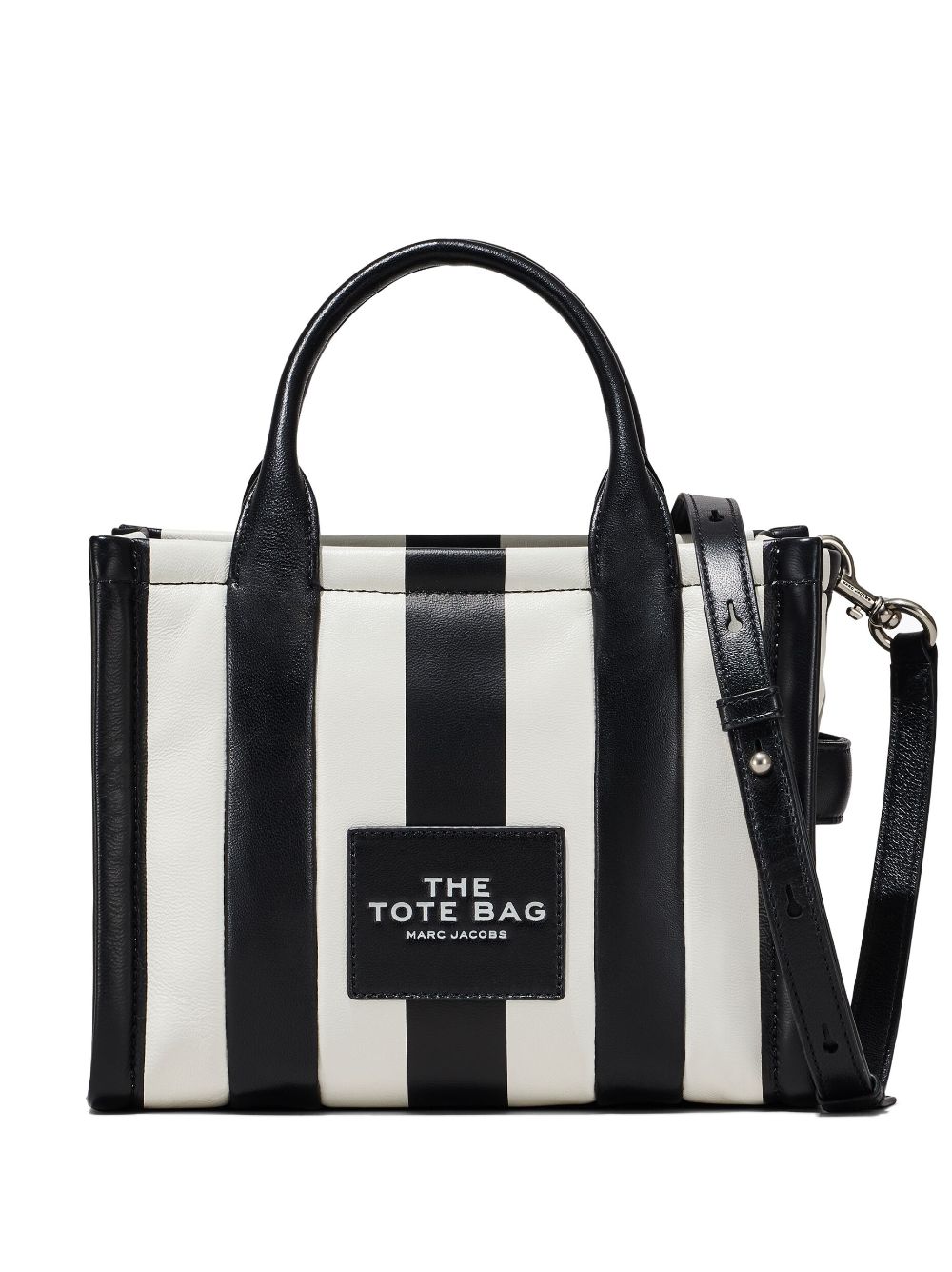 • Designed with a vertical stripe pattern, this The Tote bag from Marc Jacobs is embellished with a logo detail on the front. The black and white accessory is topped with two handles and a detachable shoulder strap.