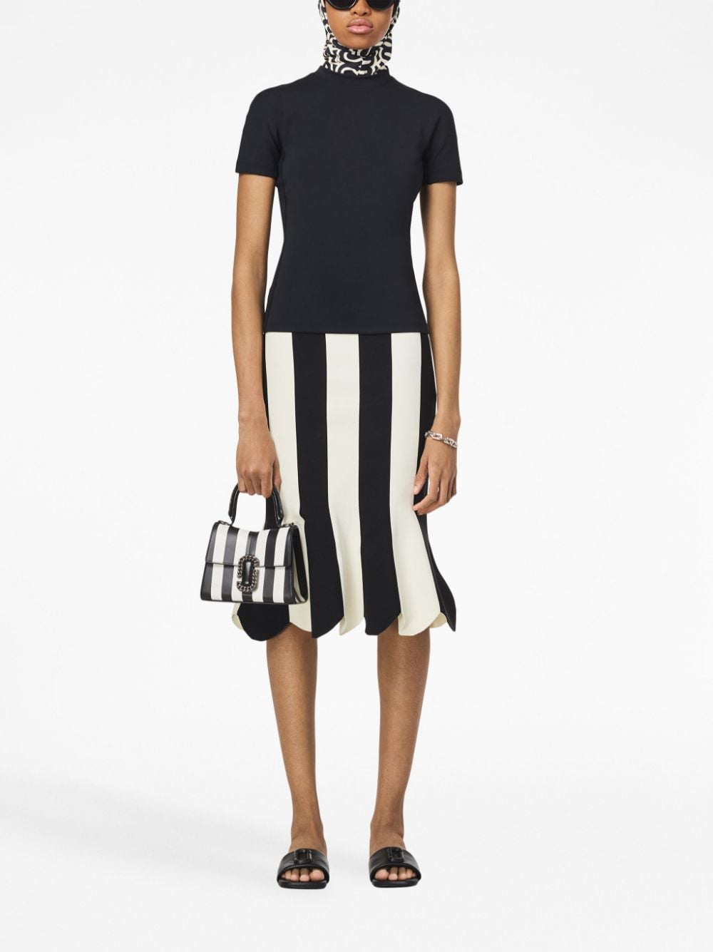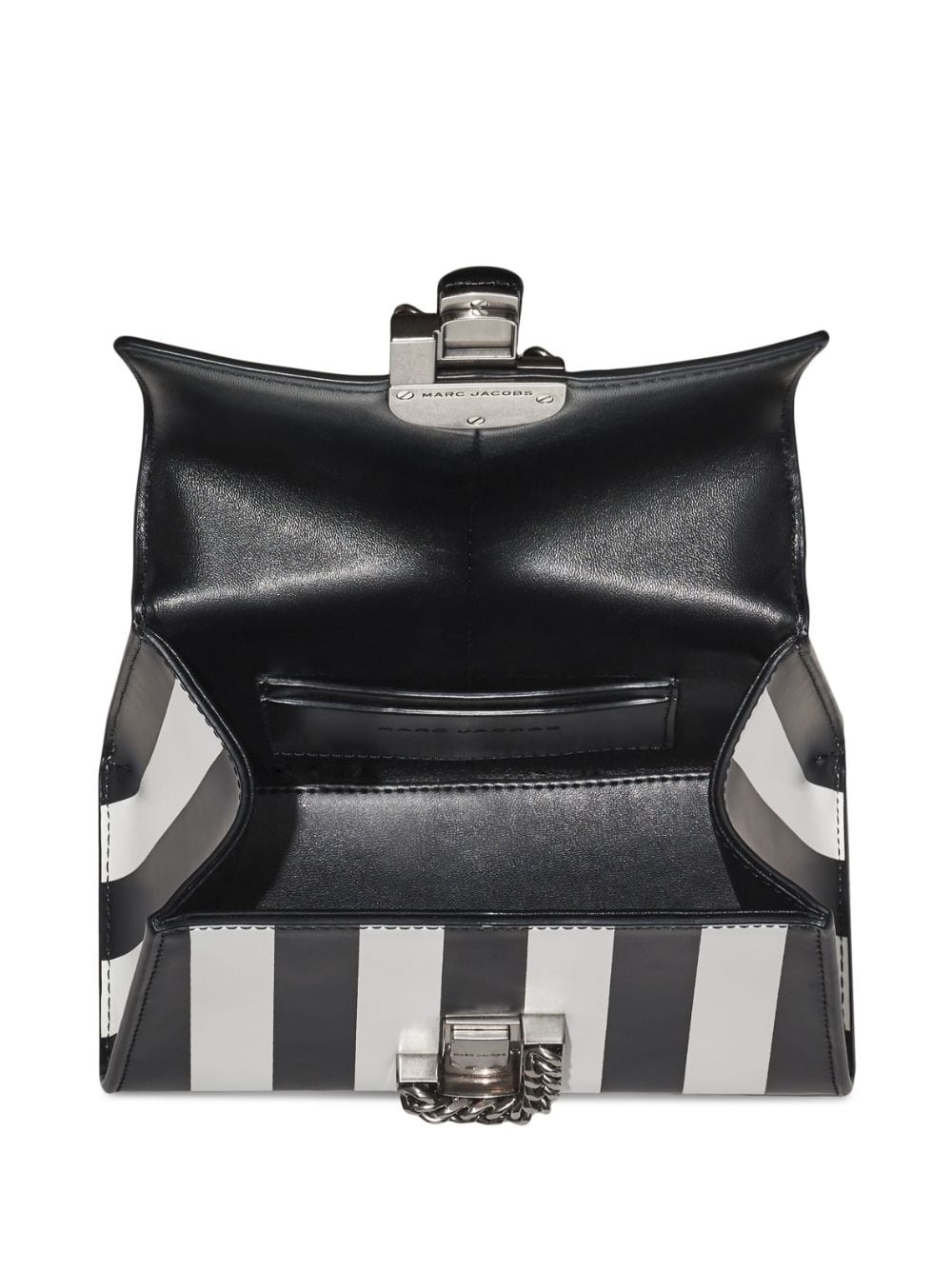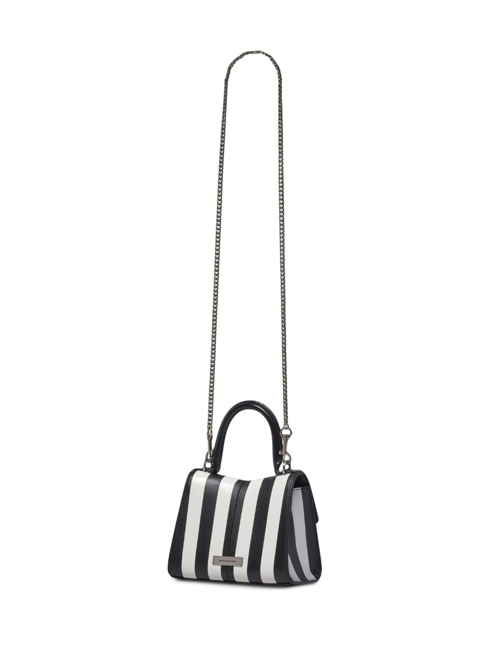 Black and white stripes adorn this Marc Jacobs bag from the AW23 season. In a classic silhouette, the leather-constructed accessory boasts an instantly recognisable motif: the Double J plaque. Meant to be worn as a shoulder bag — see the chain link strap that can be detached — it can also be carried by the top handle, offering a versatile look.