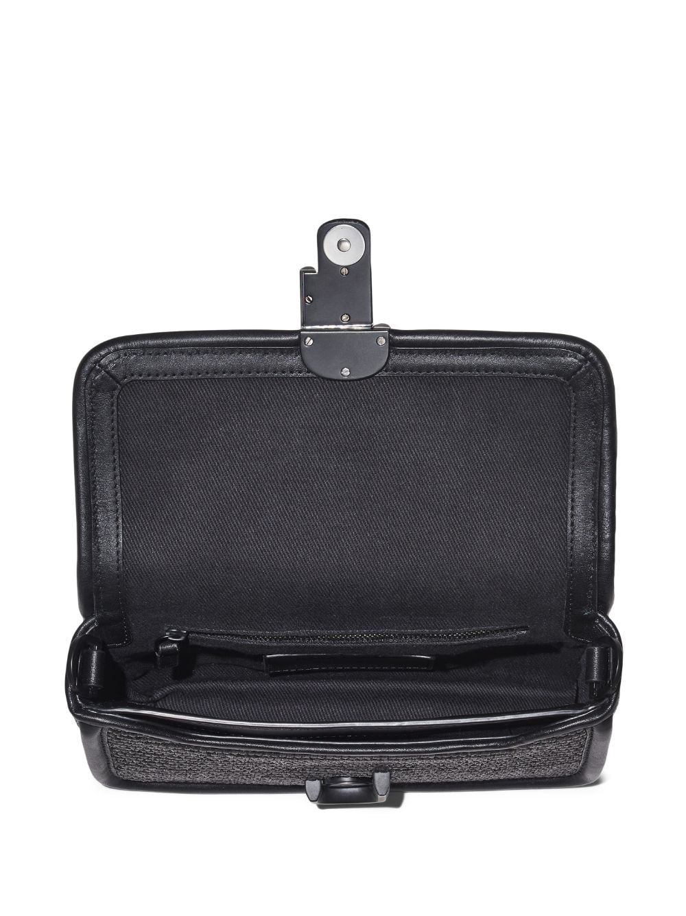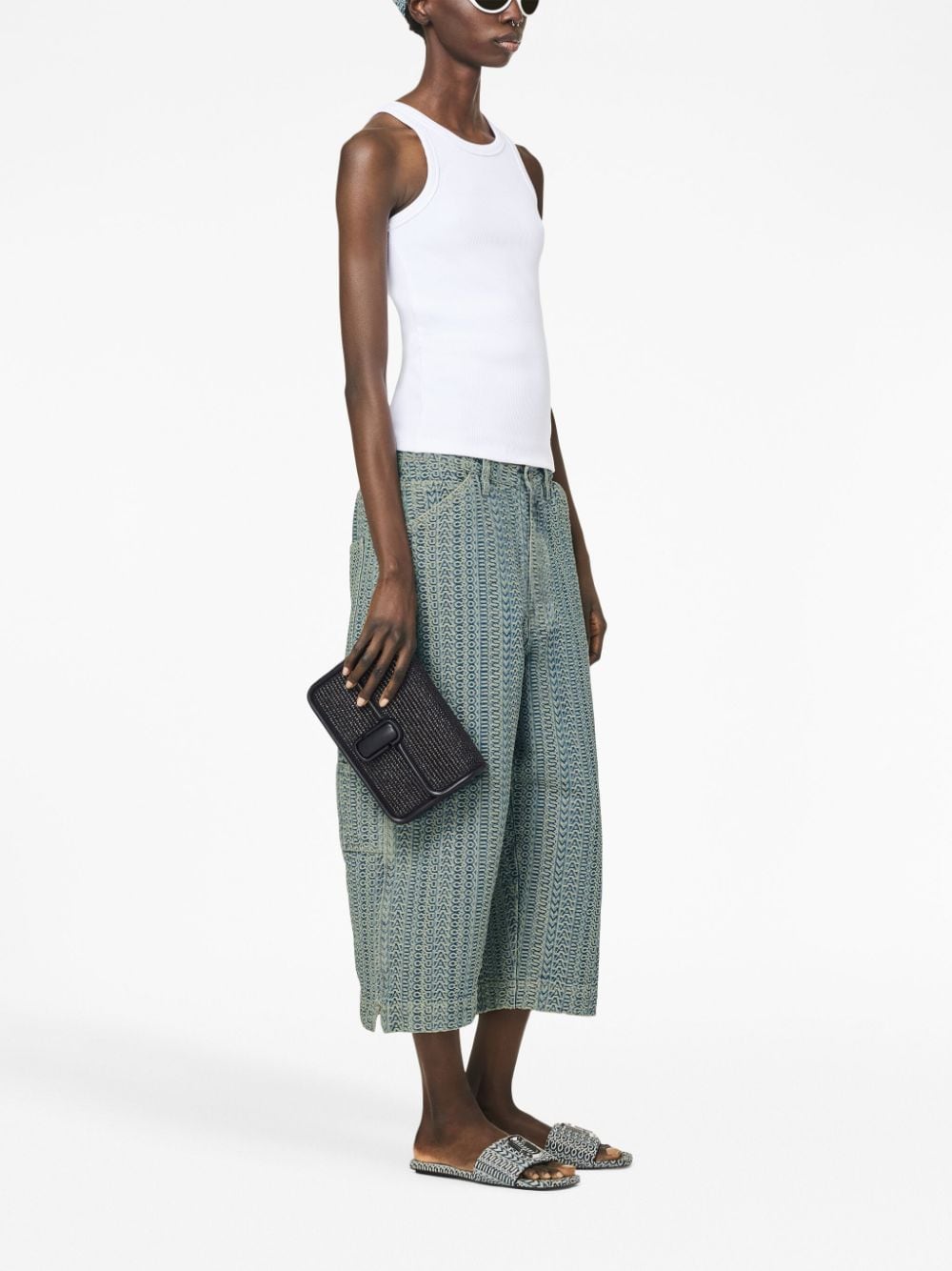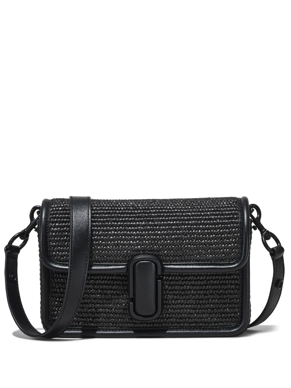 Framed by leather trims, this monochrome iteration of Marc Jacob’s The Straw bag is woven from raffia. Suspended by an adjustable leather strap, it’s topped with a logo clasp.