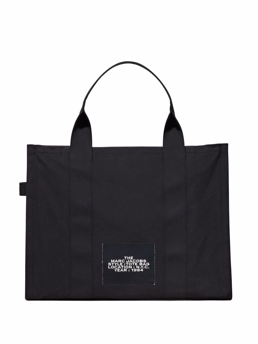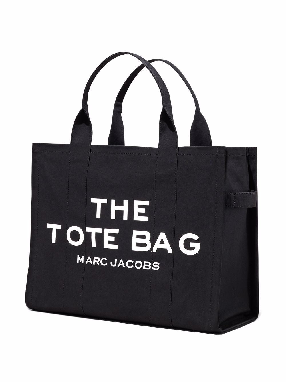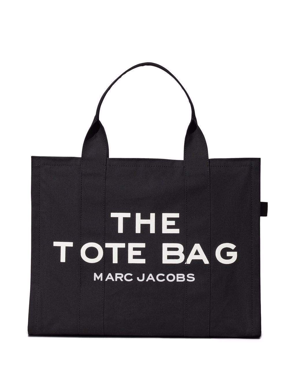 Black/white cotton The XL Tote bag from Marc Jacobs featuring slogan print to the front, logo print to the front, logo patch to the rear, two rounded top handles, top zip fastening, main compartment and internal slip pocket.