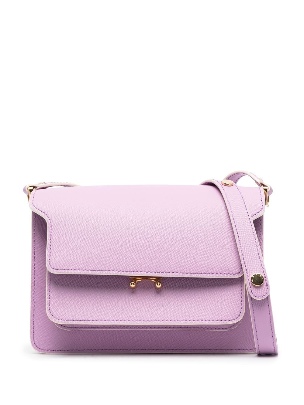Trunk leather shoulder bag from MARNI featuring lavender purple, calf leather, gold-tone hardware, engraved logo, accordion design, adjustable shoulder strap, foldover top, partitioned compartment and internal zip-fastening pocket.