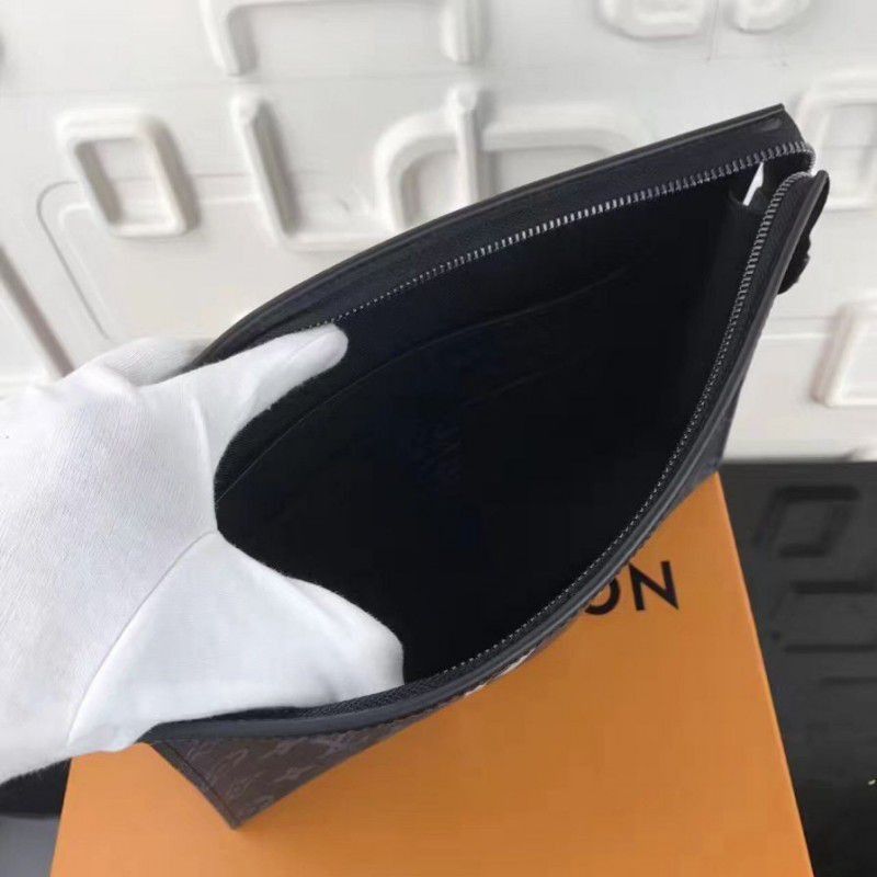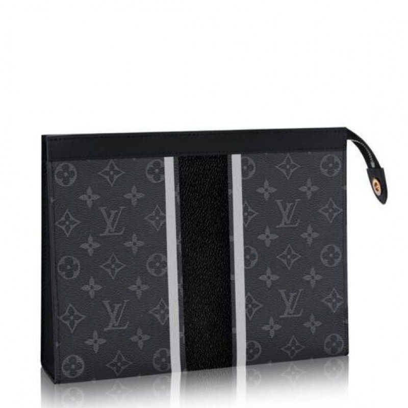 Designed in collaboration with the Japanese designer Hiroshi Fujiwara, the POCHETTE VOYAGE MM combines both House heritage with the Monogram pattern and modernity with fine details two reflective bands and a black one, lozine edging, pocket stitching, colored Rainbow hardware for a result both sporty and fashion. The Pochette Voyage MM can either slip into a bag or be carried by hand. Its generous volume thanks to the gusset will give you an easy access to all your belongings.Monogram Eclipse coated canvas exterior
