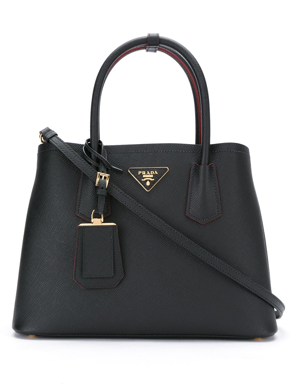 Founded by Mario Prada, the brand is known for producing timeless items with traditional Milanese construction. Expect to see outerwear with a utilitarian twist and vibrant accessories that have amassed a cult following. Black calf leather Bibliotheque tote bag featuring top handles and a main internal compartment.
