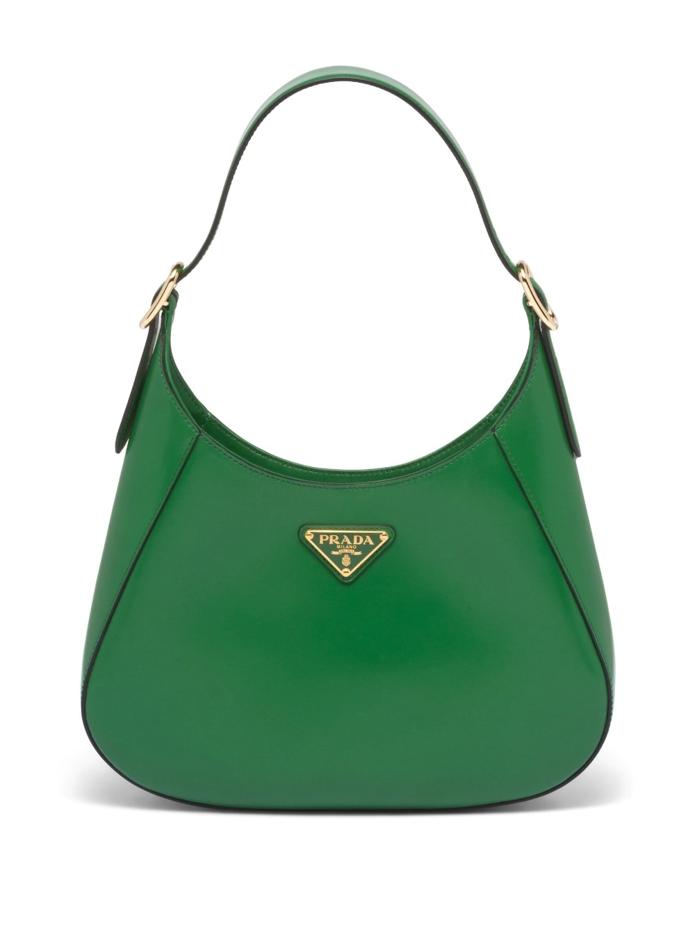 calf-leather shoulder bag from PRADA featuring green, calf leather, gold-tone hardware, enamel triangle logo, magnetic fastening, single shoulder strap, main compartment and internal slip pocket.