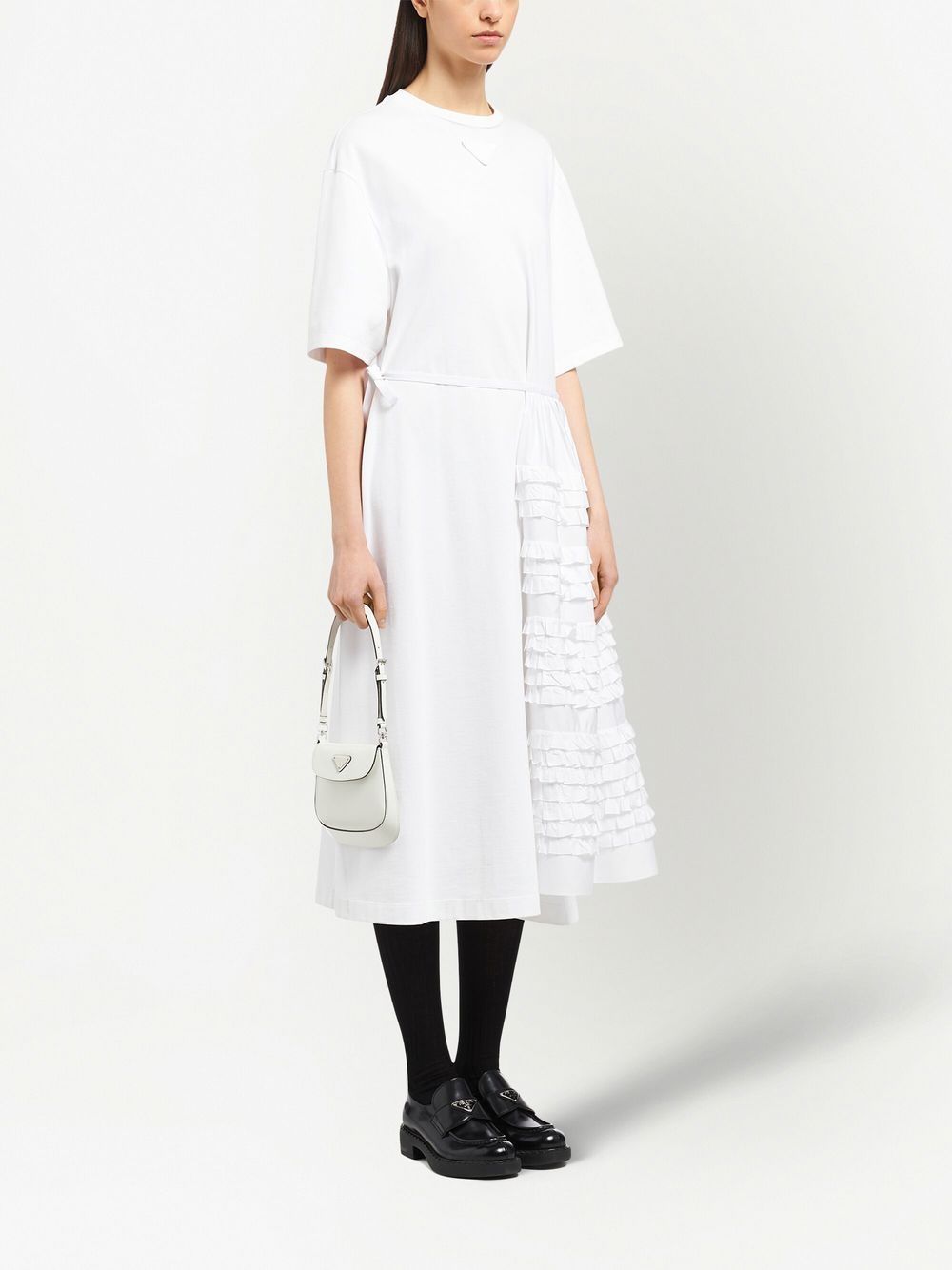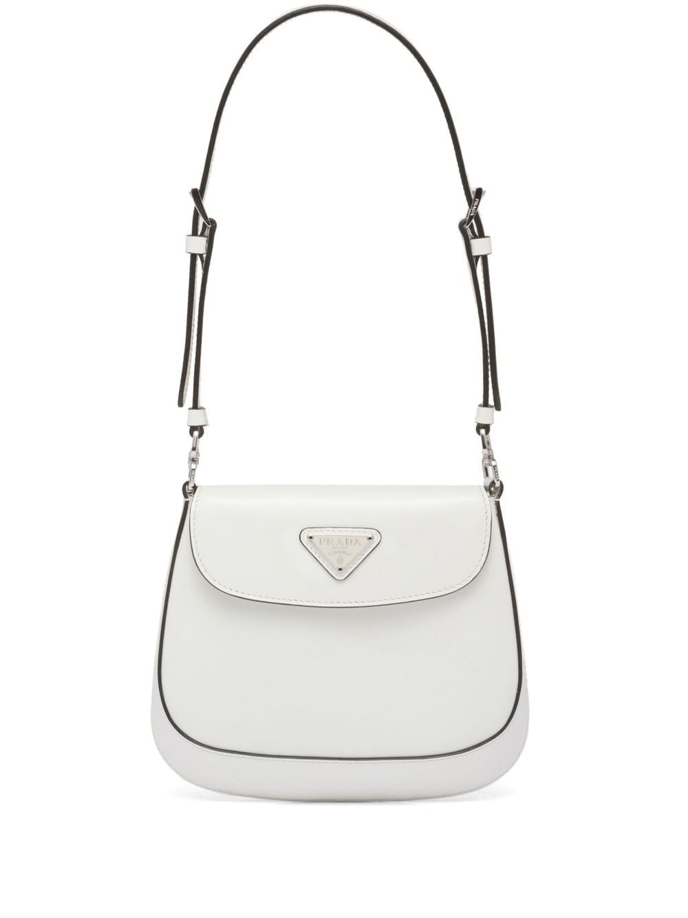 Cleo shoulder bag from PRADA featuring white, leather, enamel triangle logo, silver-tone hardware, adjustable shoulder strap, foldover top with magnetic fastening, internal logo plaque and brushed effect.