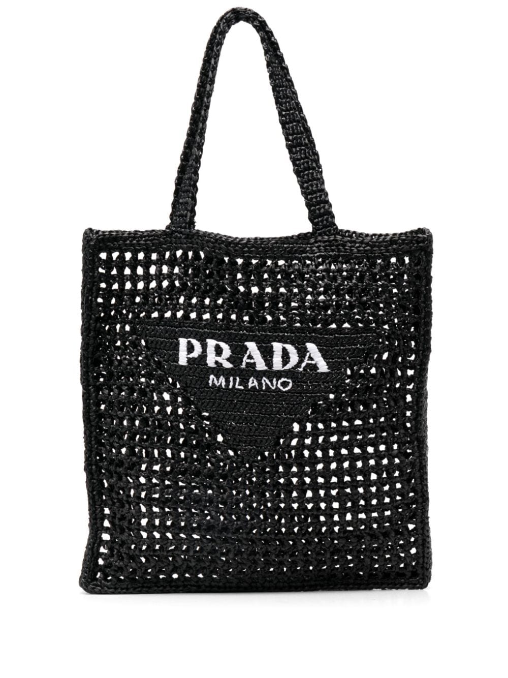 The original wordmark design, first used in 1919 is showcased at the front of this Prada tote bag, adding an element of the brand’s history to a contemporary interwoven design.