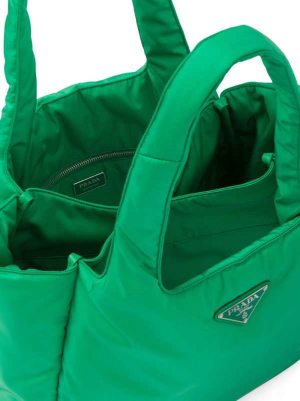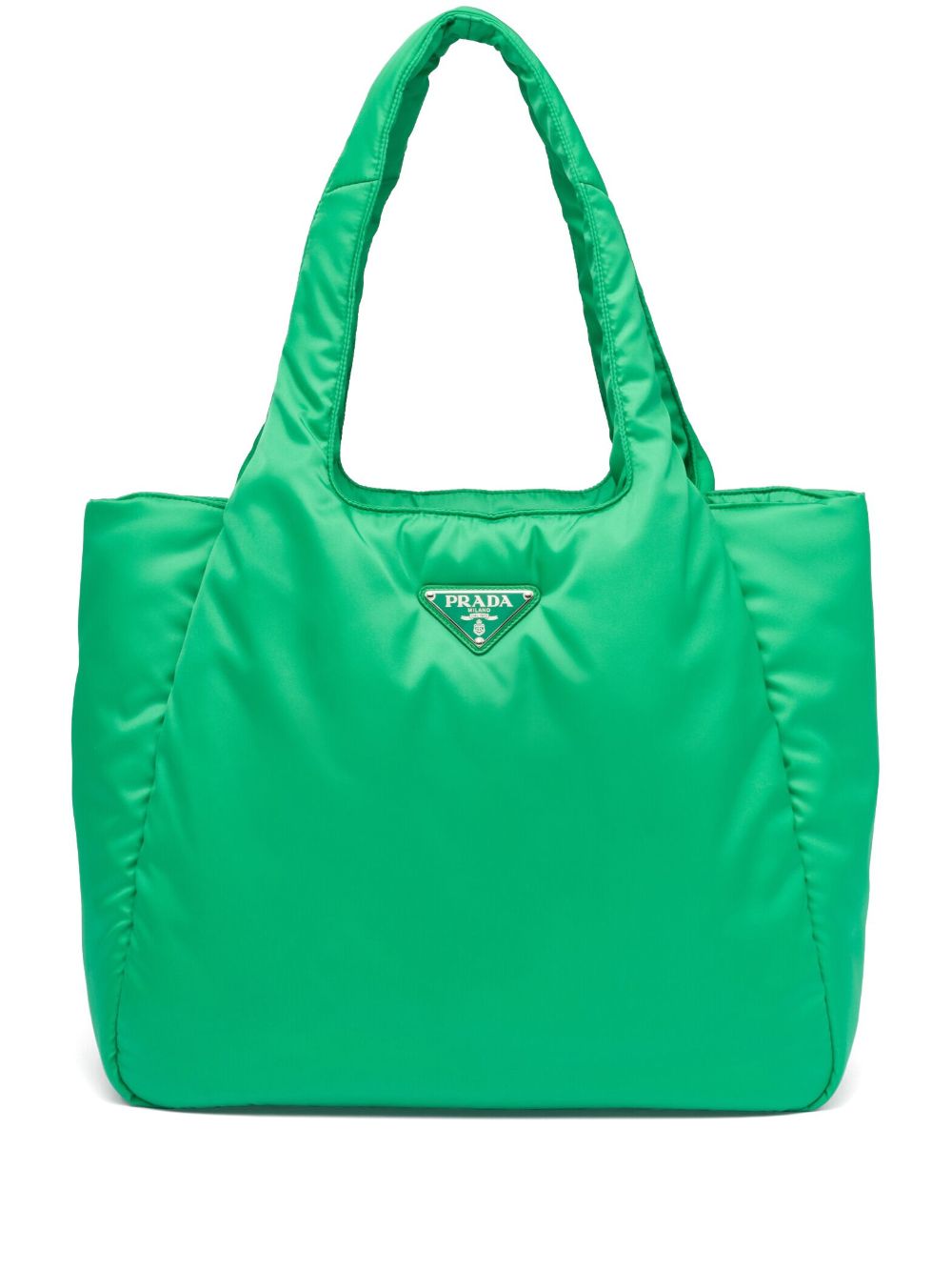 In the large green-hued iteration of this iconic tote bag, Prada continues the minimalist padded construction with a partitioned compartment and two top handles. The signature enamel triangle logo plaque can be seen at the front, for an instantly recognisable look.