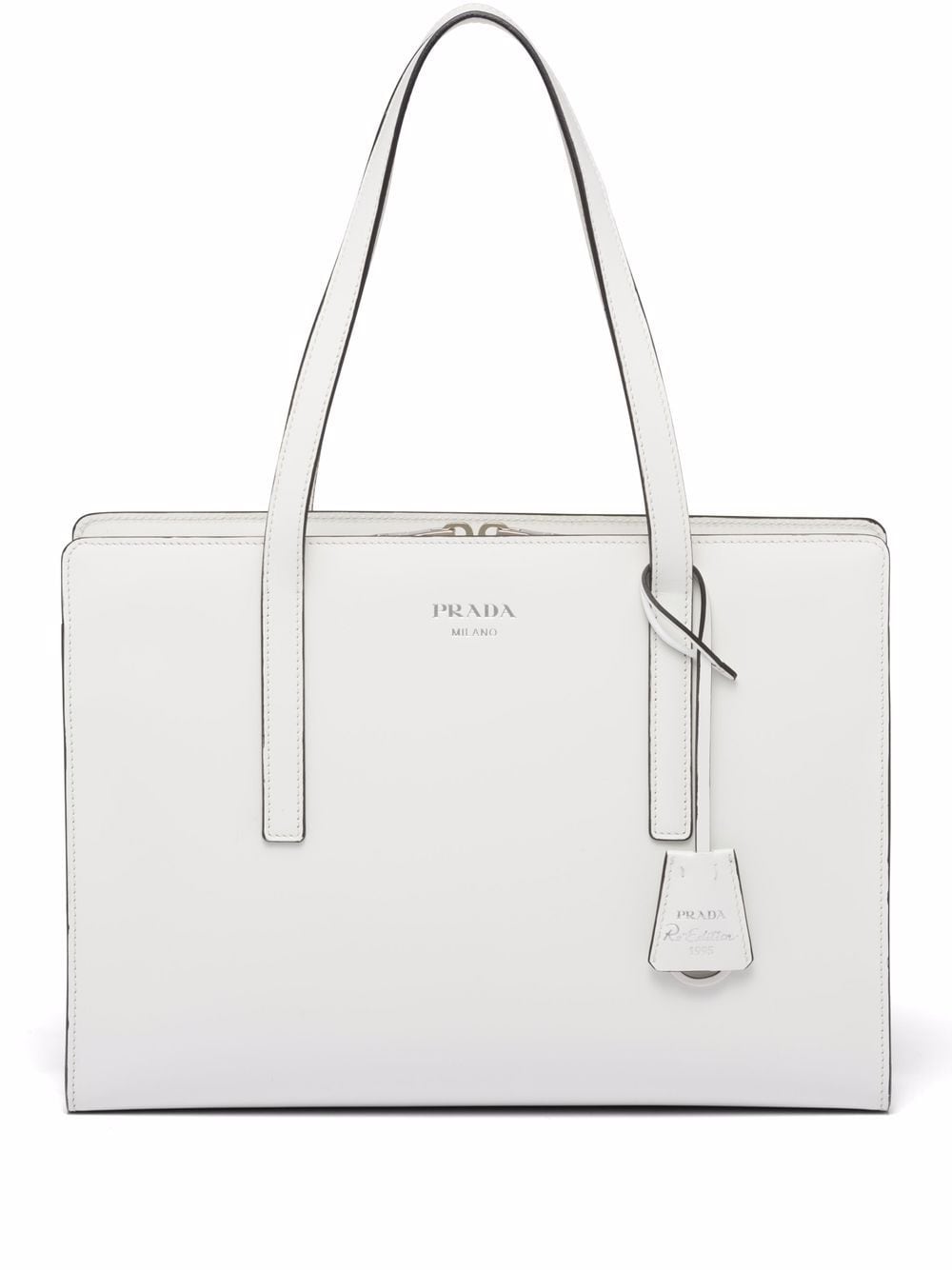 Minimal in design, this tote bag is a re-edition of the iconic Prada bag of 1995. A key element in this item, the silver-toned embossed logo on the front stands out against the white leather background.